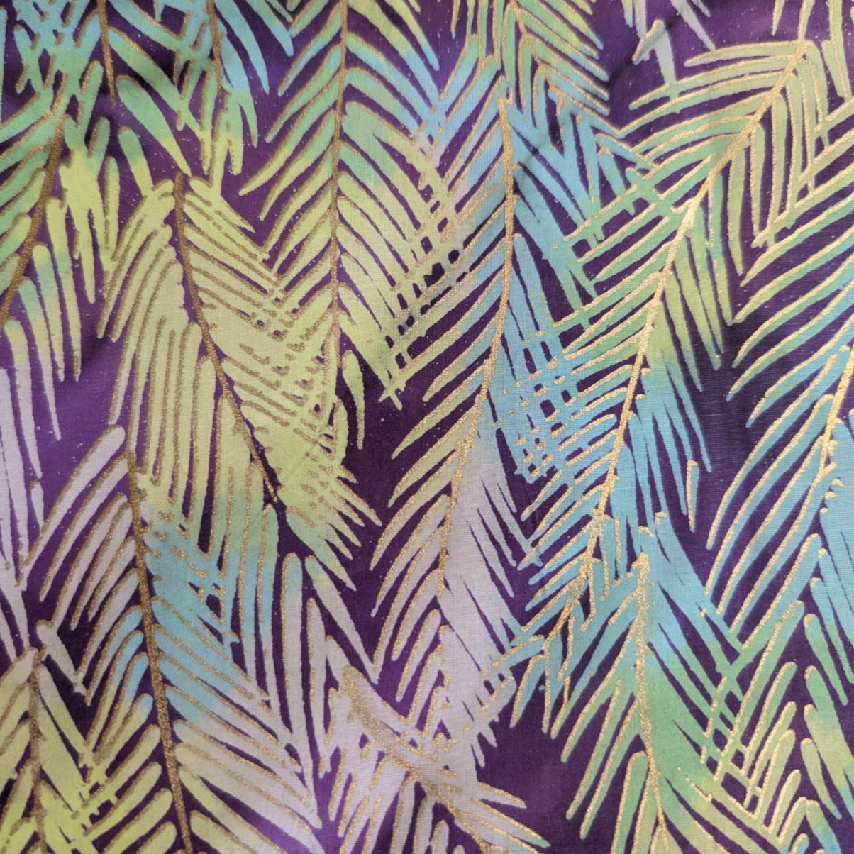 DESCRIPTION: Golden Leaves Quilting Fabric in Batik Multi features a pattern of palm fronds or fern-like leaves. These fronds are depicted in various shades of green and blue, creating a vibrant, tropical, or island-inspired aesthetic. The background of the fabric is a deep purple, providing a rich contrast to the lighter-colored fronds.