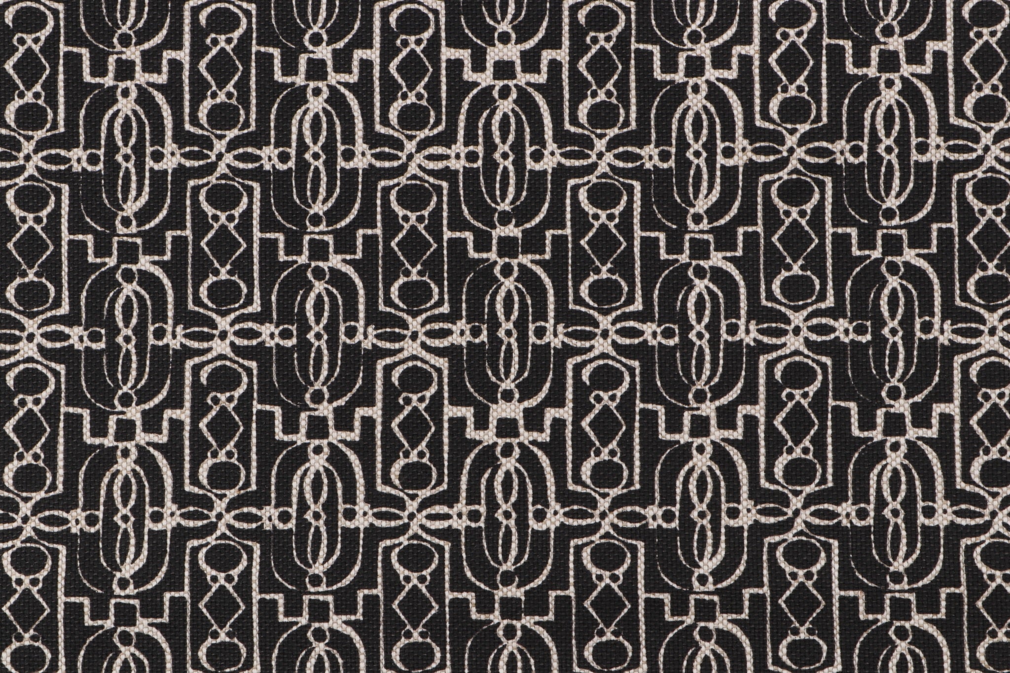 DESCRIPTION: Lacefield Designs Lucia Fabric in Granite features a repeating geometric block print pattern in black and cream. The design has a contemporary or retro feel.