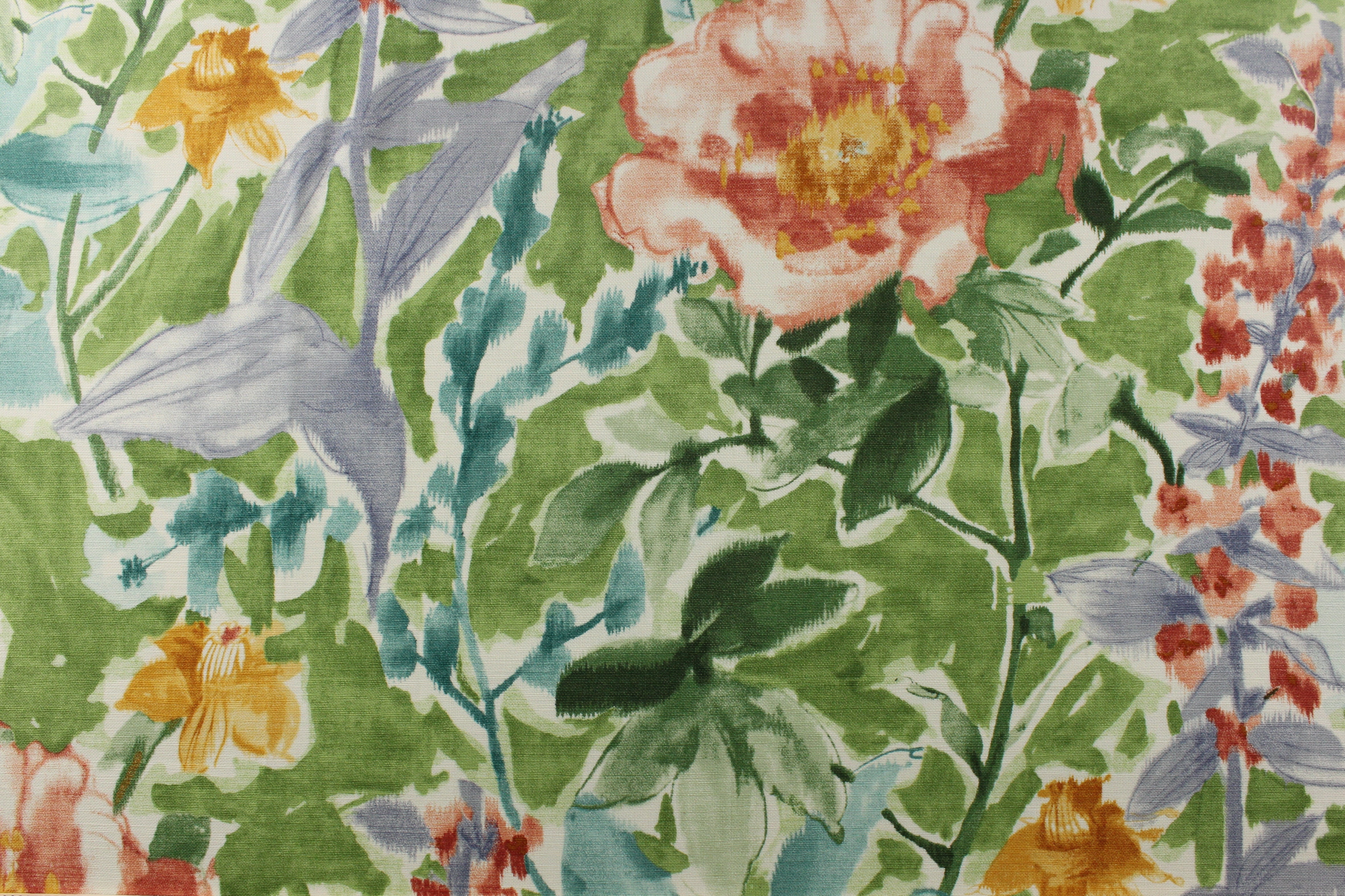 DESCRIPTION: This fabric offers a stunning floral design with a watercolor appearance in shades of green, yellow, purple gray, orange red, turquoise blue and white within the floral design. It has a very soft light feel to it. This fabric can be used for window treatments (draperies, valances, swags, curtains), duvet covers, toss pillows, etc. It also has a soil and stain repellant finish. We offer this fabric in two colors. This fabric is a great way to add color and beauty to any project.