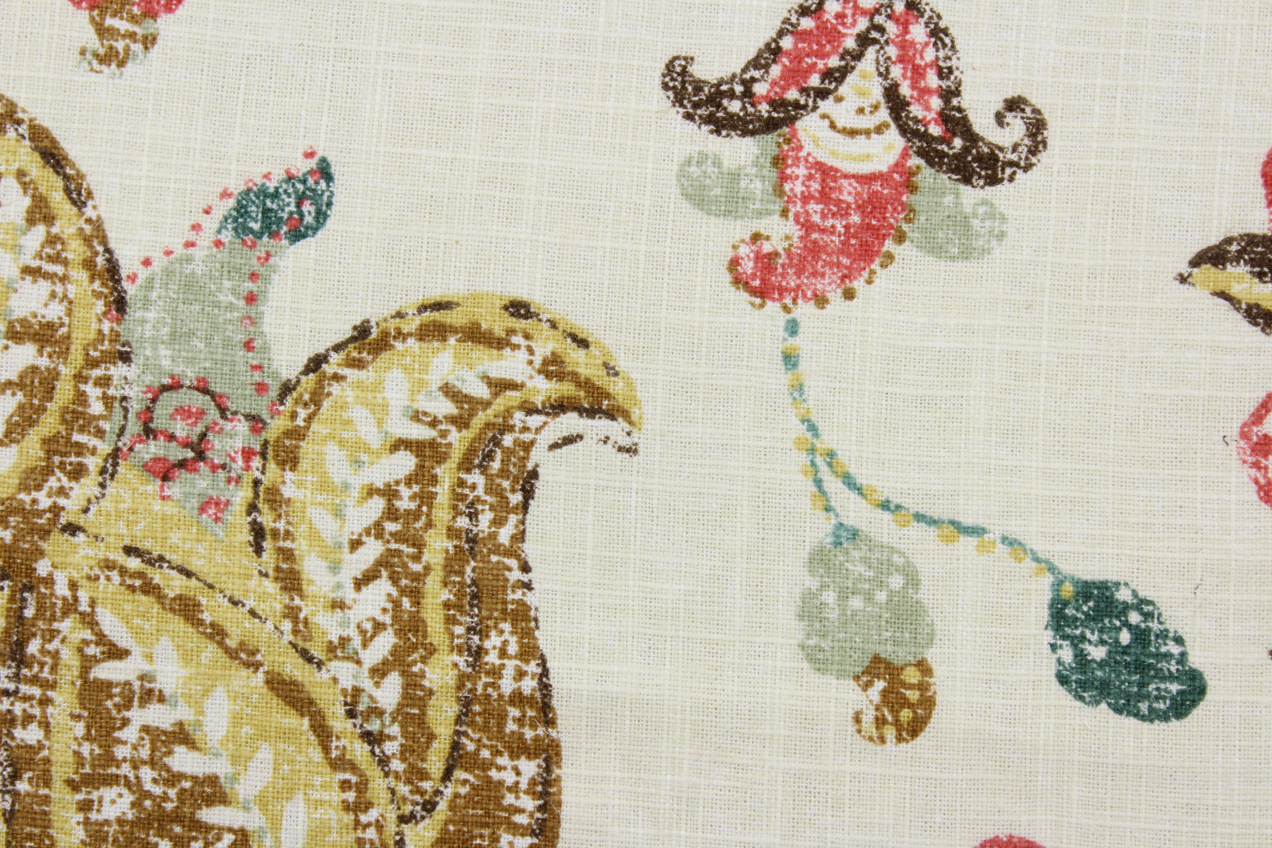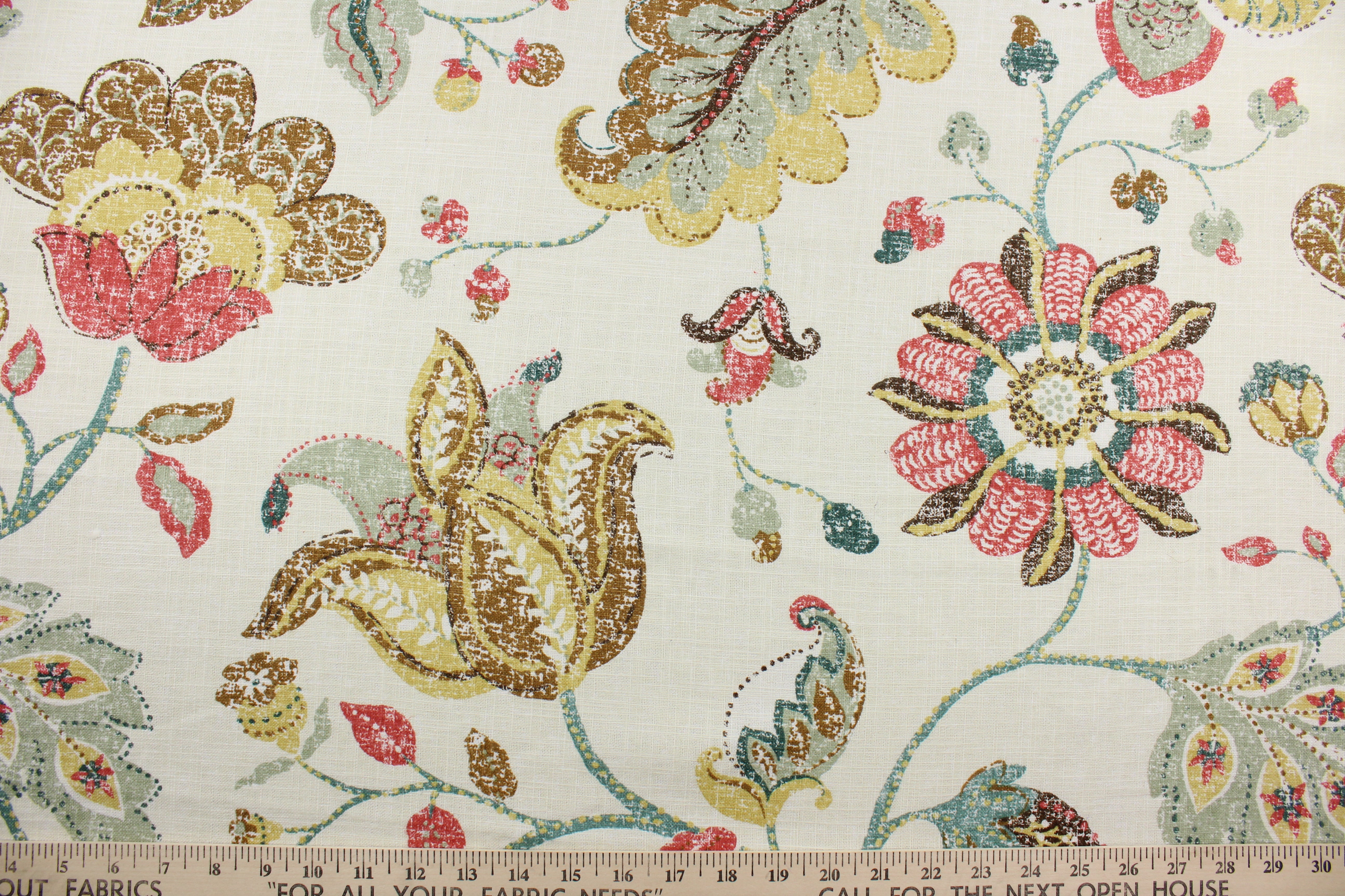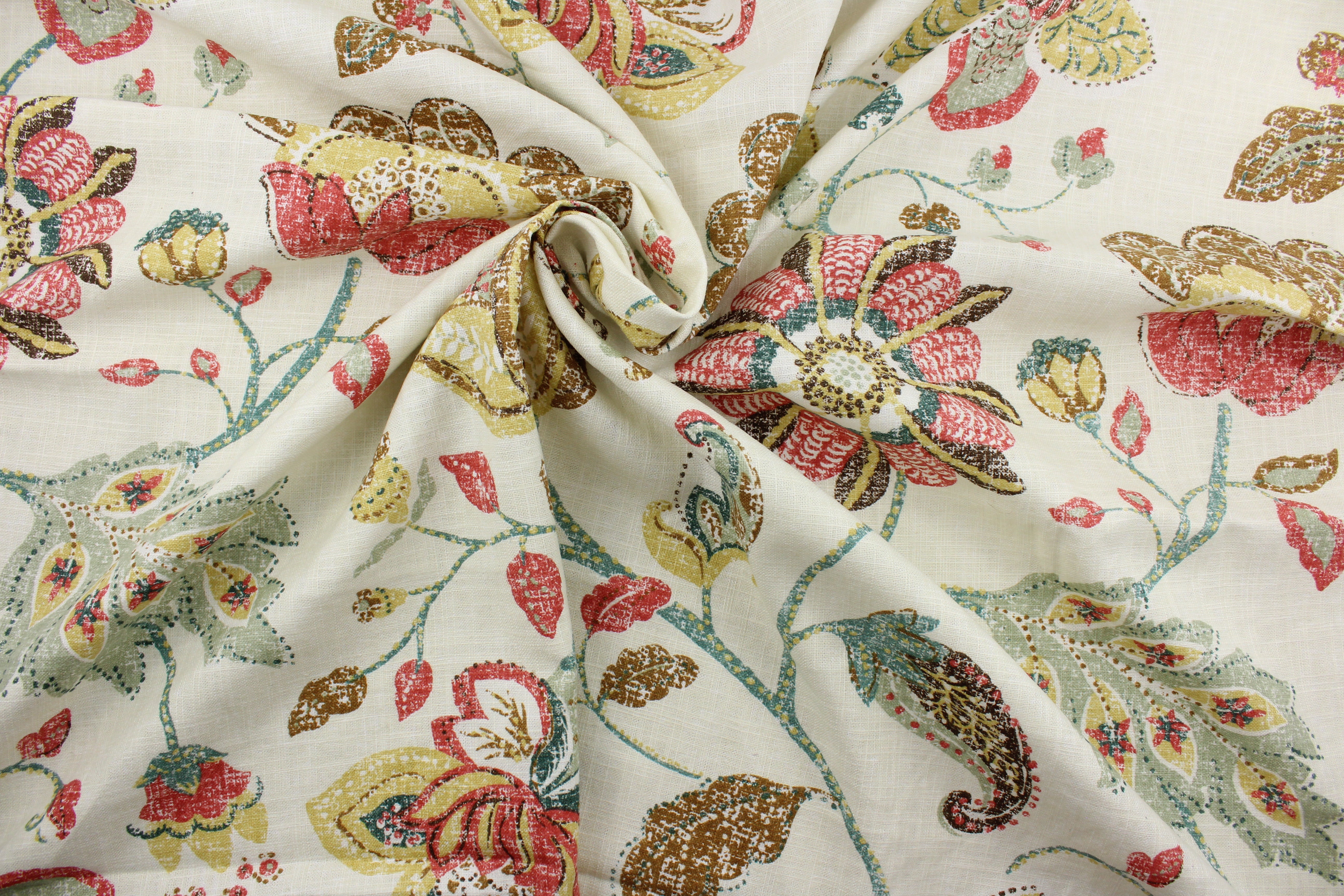 DESCRIPTION:  Robert Allen© Spring Mix in Pomegranate, a multi-use linen blend fabric featuring a classic mottled floral and leaf print.  Its lovely pomegranate, brown, goldenrod, moss green, and teal blend beautifully against an ivory background, and it offers top-notch durability with 30,000 double rubs and stain and water repellent protection. It can be used for several different statement projects including window accents (drapery, curtains and swags), toss pillows, headboards, bed skirts, duvet covers, upholstery, and more.