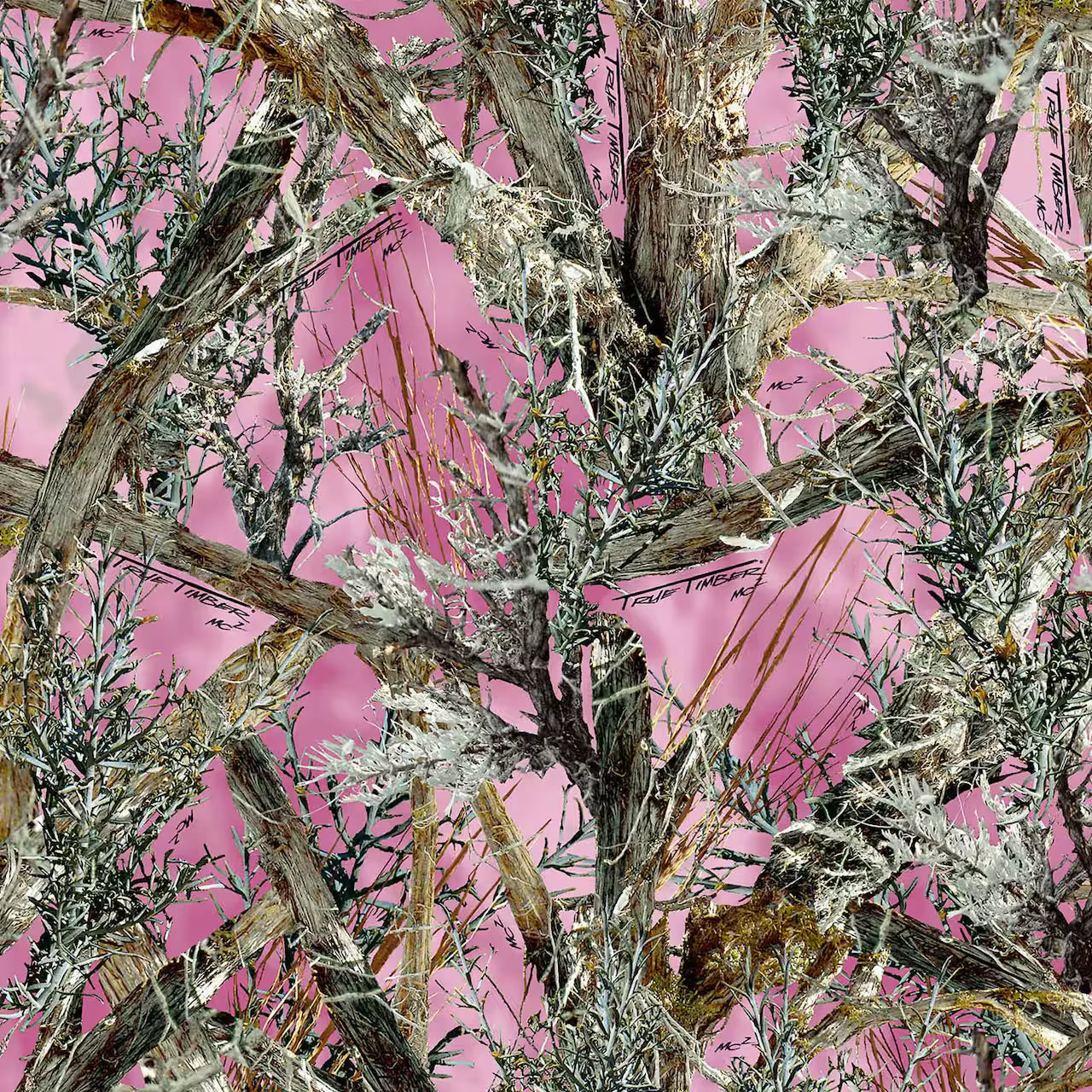 DESCRIPTION: TrueTimber® MC2 Camo Quilting Fabric in Pink  features a camouflage print featuring a realistic, detailed mix of natural elements like twigs, branches, and leaves. These natural elements are rendered in shades of brown, gray, and green, set against a vibrant pink background.