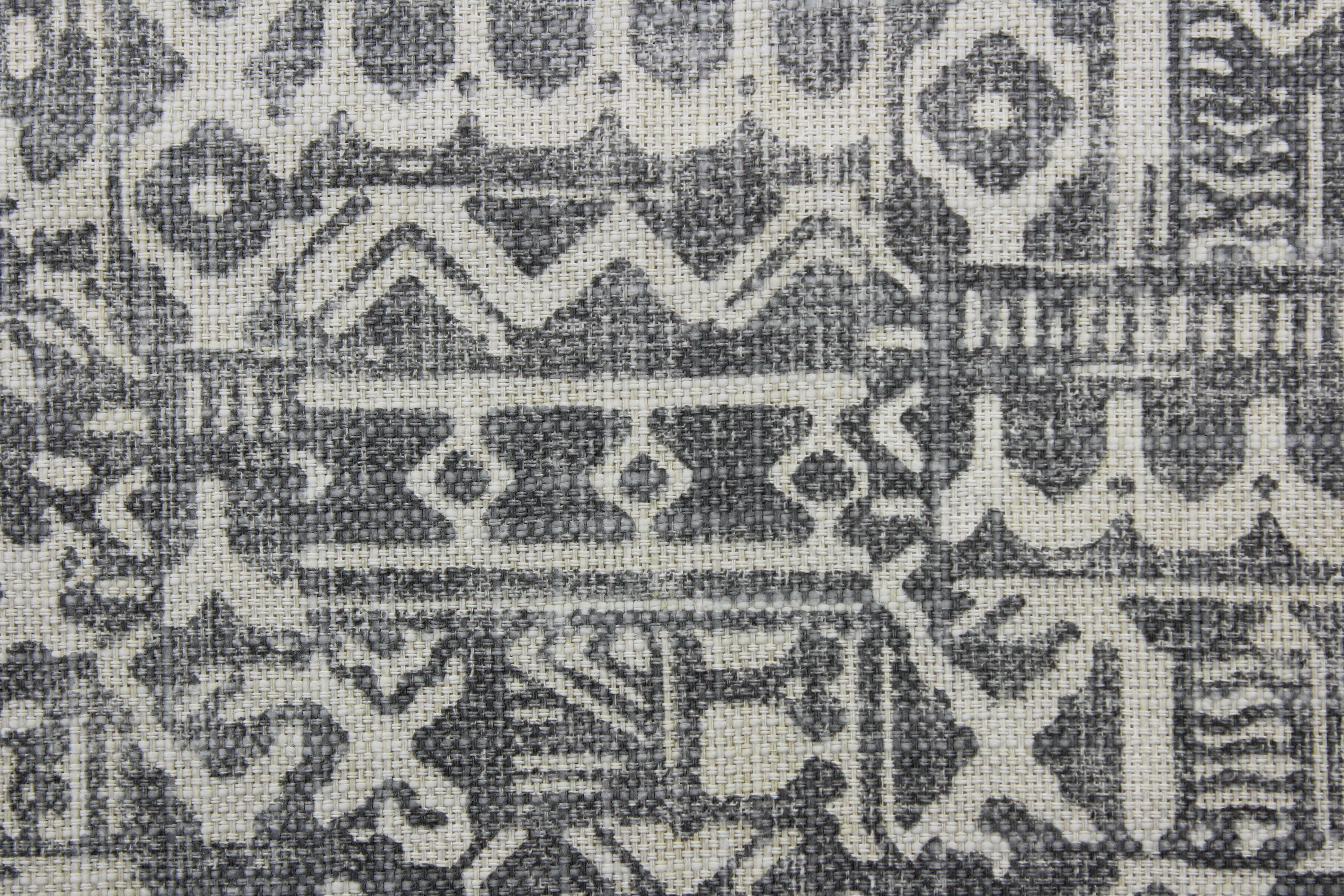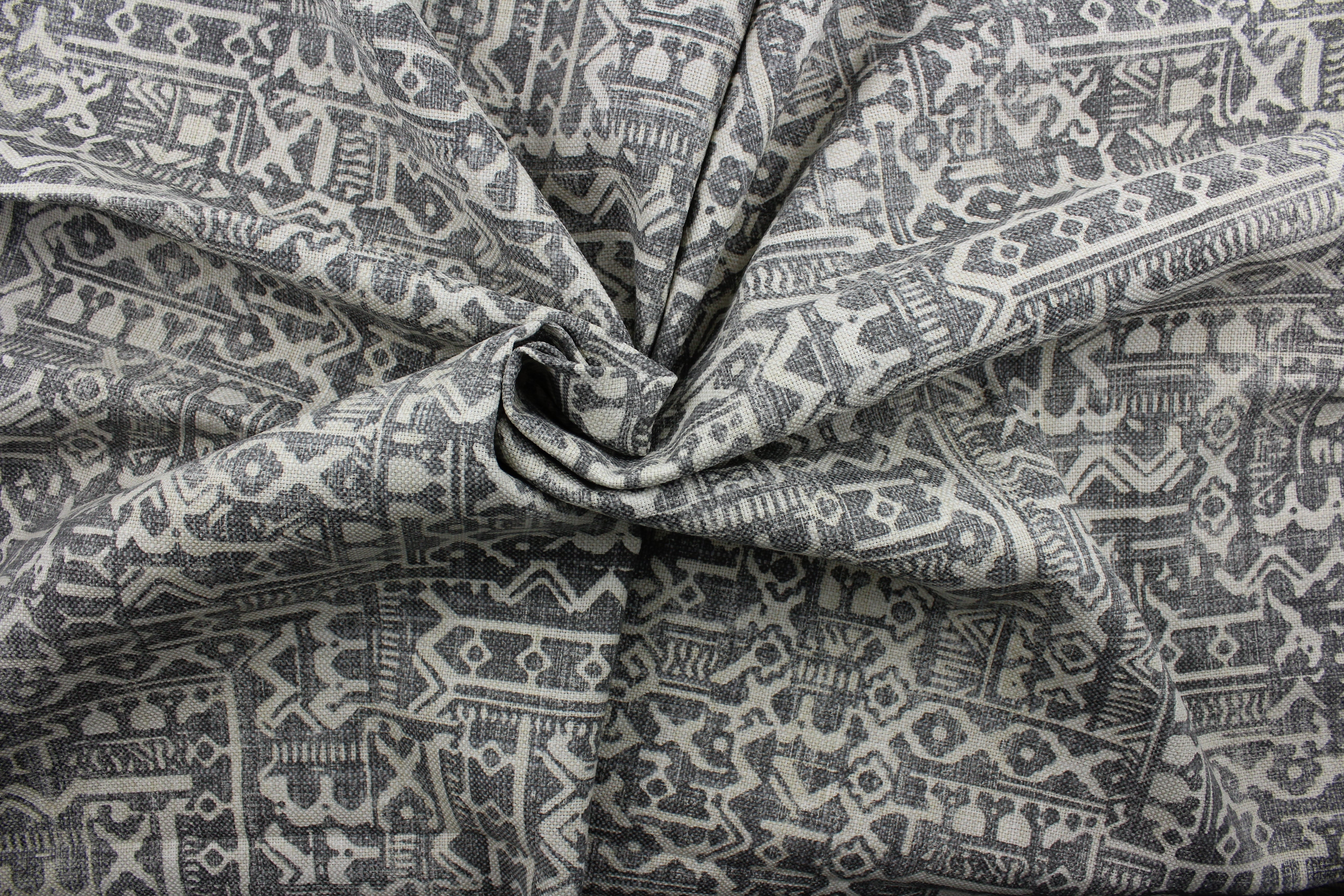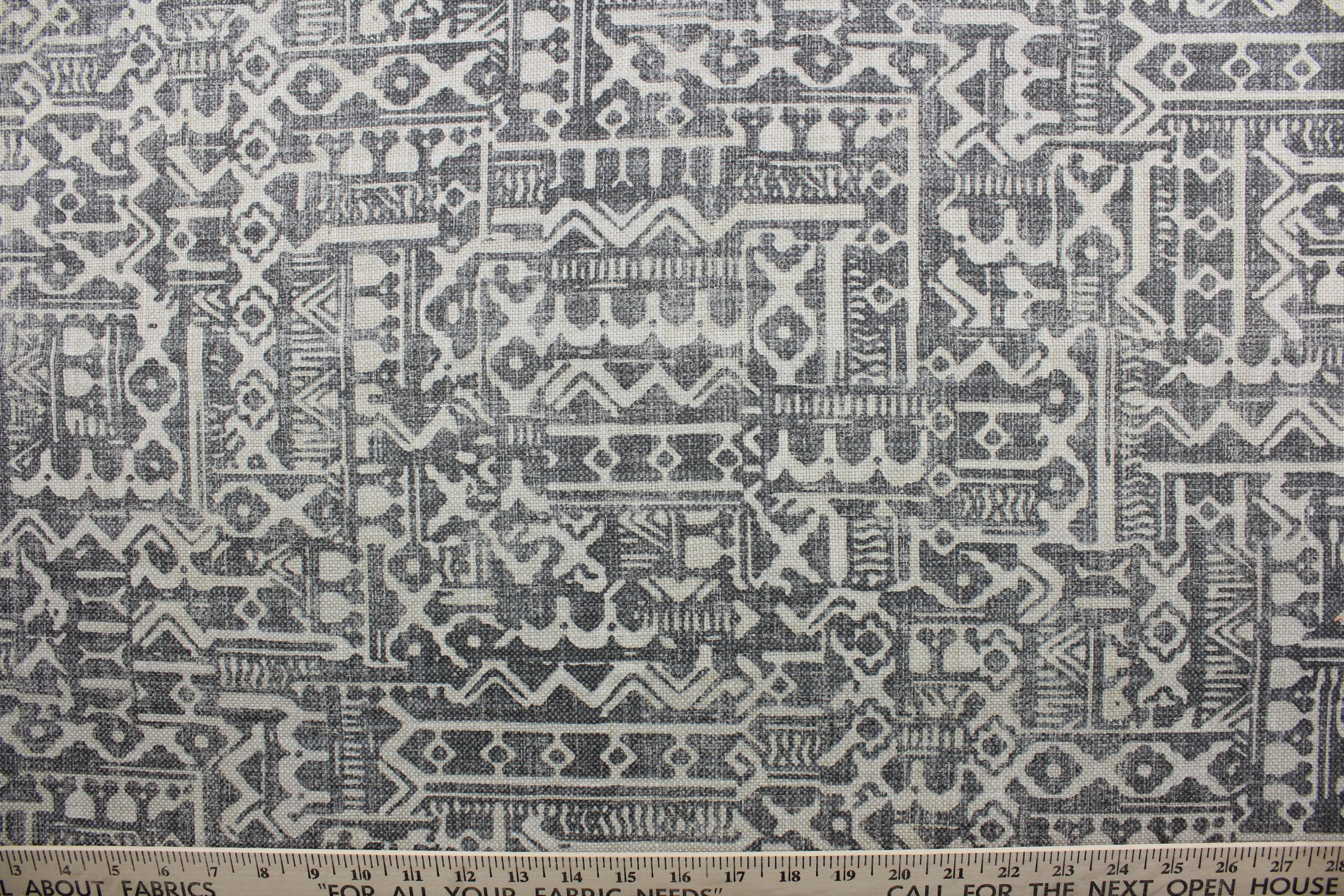 DESCRIPTION: This fabric is beautifully crafted with a cotton/linen blend for a unique style that stands out. The southwest ethnic-inspired print is featured in a timeless mix of charcoal gray on a natural colored background. on a durable 20,000 double-rub fabric. It can be used for several different statement projects including window accents (drapery, curtains and swags), decorative pillows, hand bags, bed skirts, duvet covers, upholstery and craft projects.