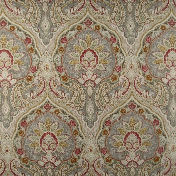 DESCRIPTION: A fabric with a traditional paisley pattern featuring a medley of colors including red, gold, and green on a beige background.