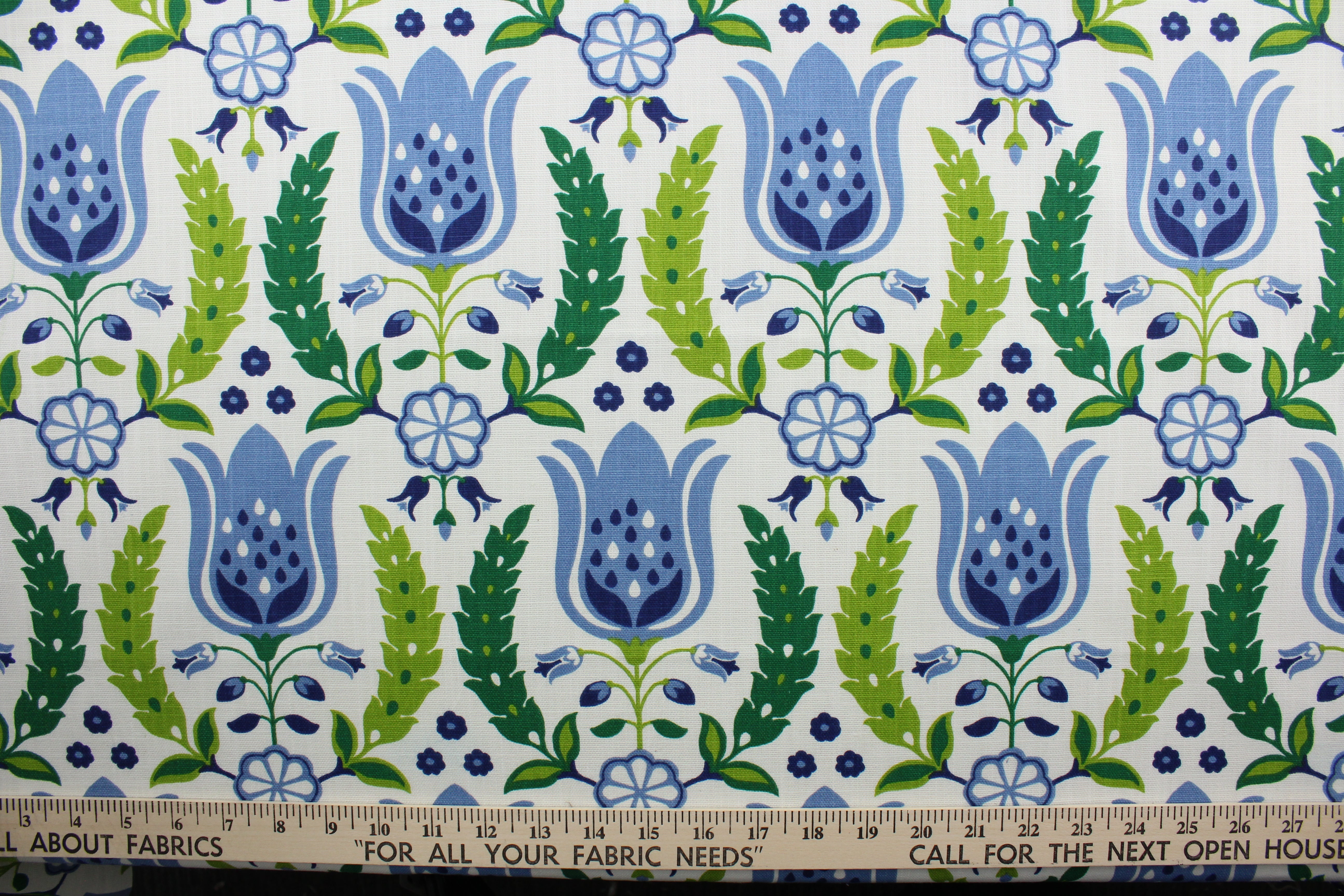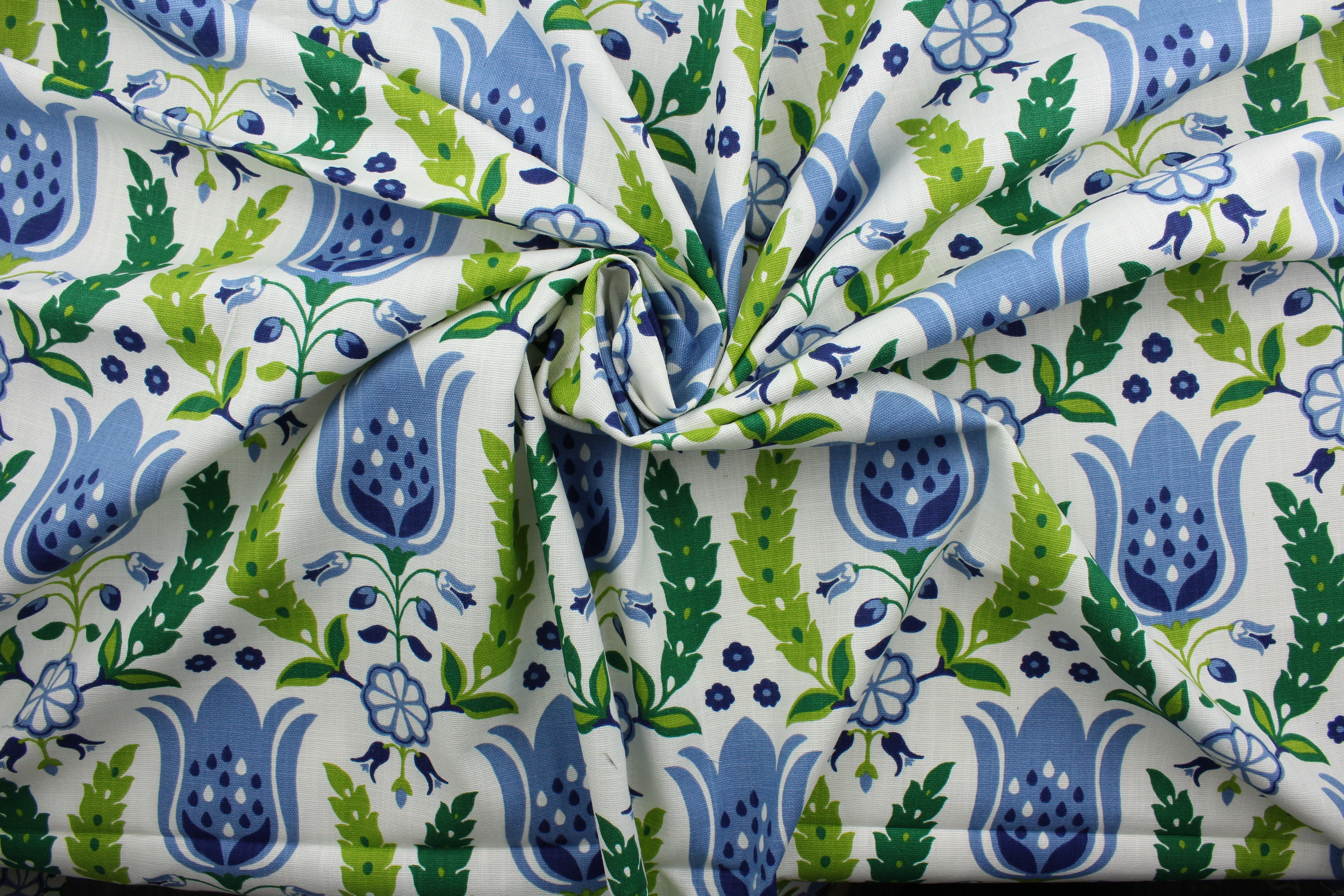 DESCRIPTION: Robert Allen© Ornate Frame in Ultramarine features ornate tulips against a white background. Crafted with 21,000 double rubs, this design is truly versatile and perfect for any room. Enjoy the unique combination of blue and green to add a touch of charm and sophistication. It can be used for several different statement projects including window accents (drapery, curtains and swags), toss pillows, headboards, bed skirts, duvet covers, upholstery, and more.