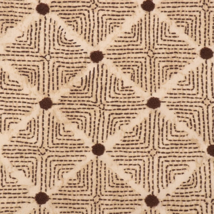 DESCRIPTION: From Ellen Degeneres’ Curated Travels Collection, Wilshire Embroidered fabric features a printed design with textured frise embroidery French knots. The color registration shows the colors mocha brown, two shades of beige, sand and cream. The embroidered French knots are mocha brown.