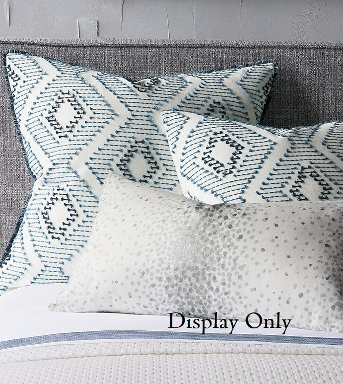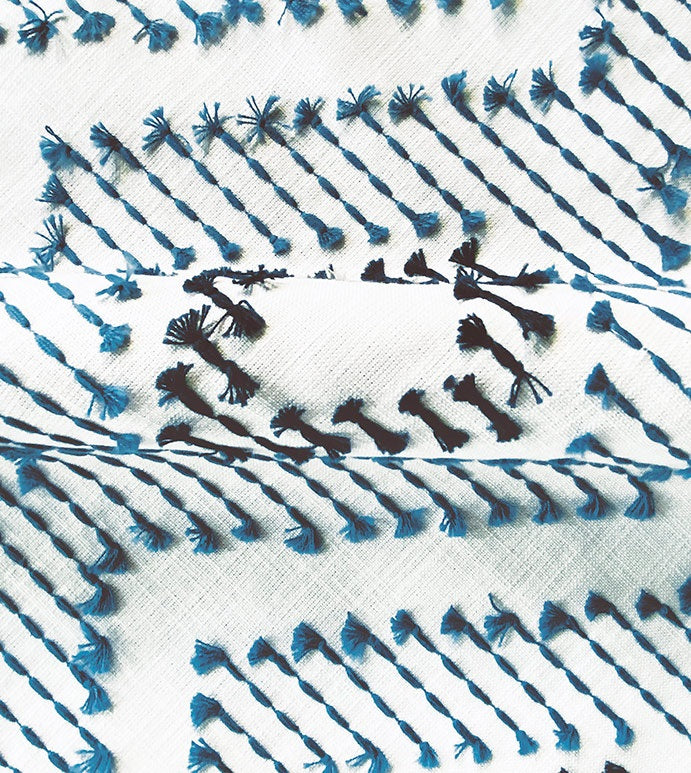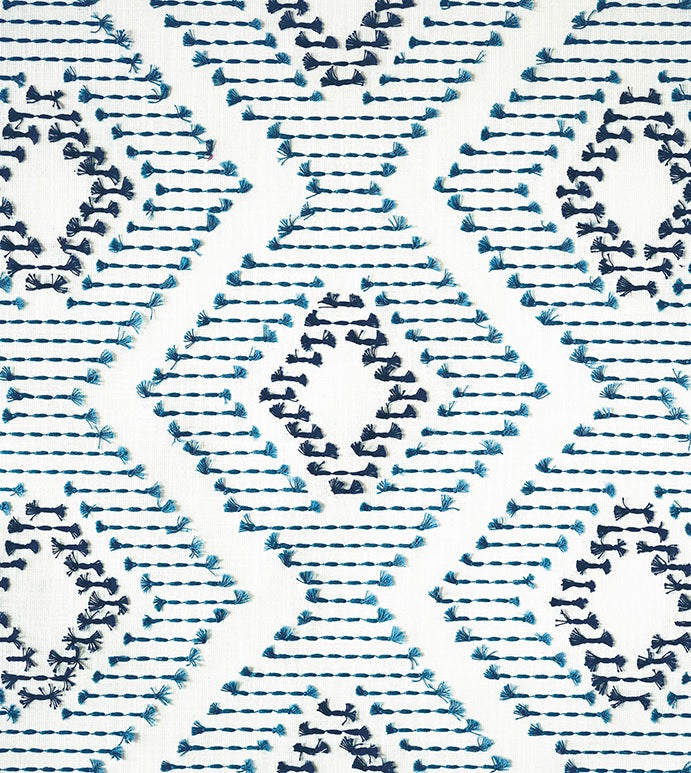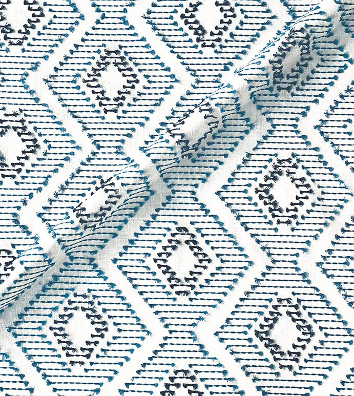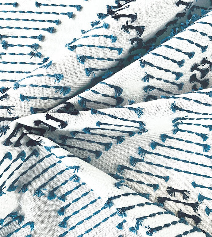 DESCRIPTION: From Eastern Accents Bridgehampton Collection by Interior designer Thom Filicia. Bridgehampton is inspired by the sprawling homes and time-honored coastal aesthetic of its Hamptons namesake, Bridgehampton. Trillium is an Ikat-inspired textural cut embroidery that adds depth and impact to the design. The color registration shows embroidery floss or stranded cotton in the colors of aegean teal and the darker aegean blue on a white background colored fabric.