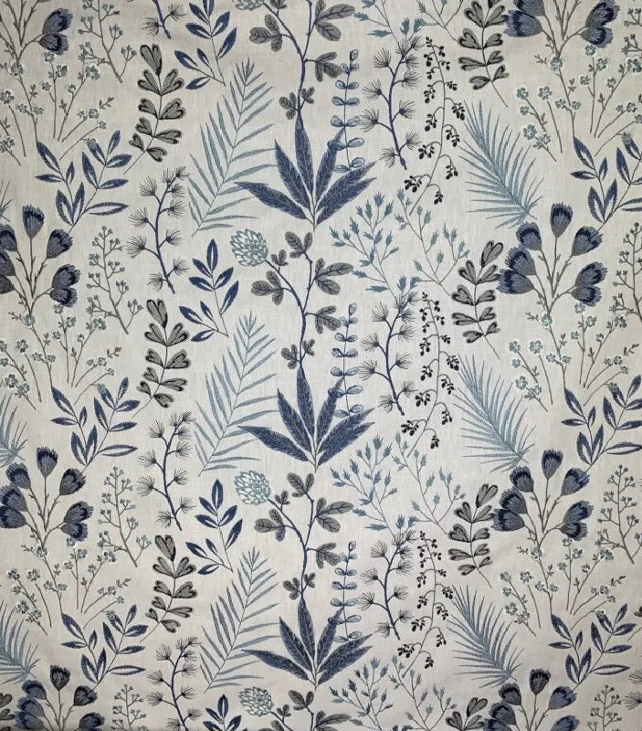 DESCRIPTION: Clarke & Clarke Bracken Embroidered Fabric in Denim features an intricate pattern of various botanical elements, including ferns, leafy branches, and small blossoms, arranged in a repeating, somewhat mirrored vertical layout. Colors are shades of blue, denim and blue jay tones, silver-gray, and black, set against a light, off-white linen-colored background.