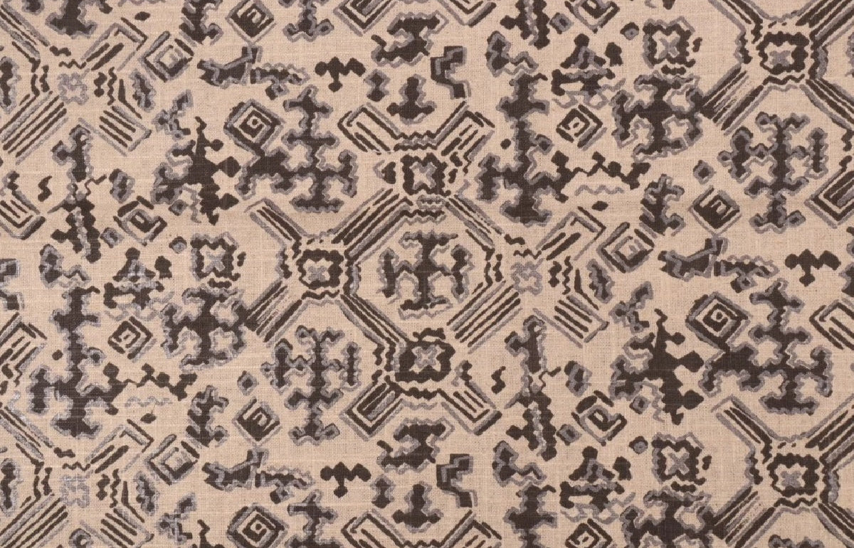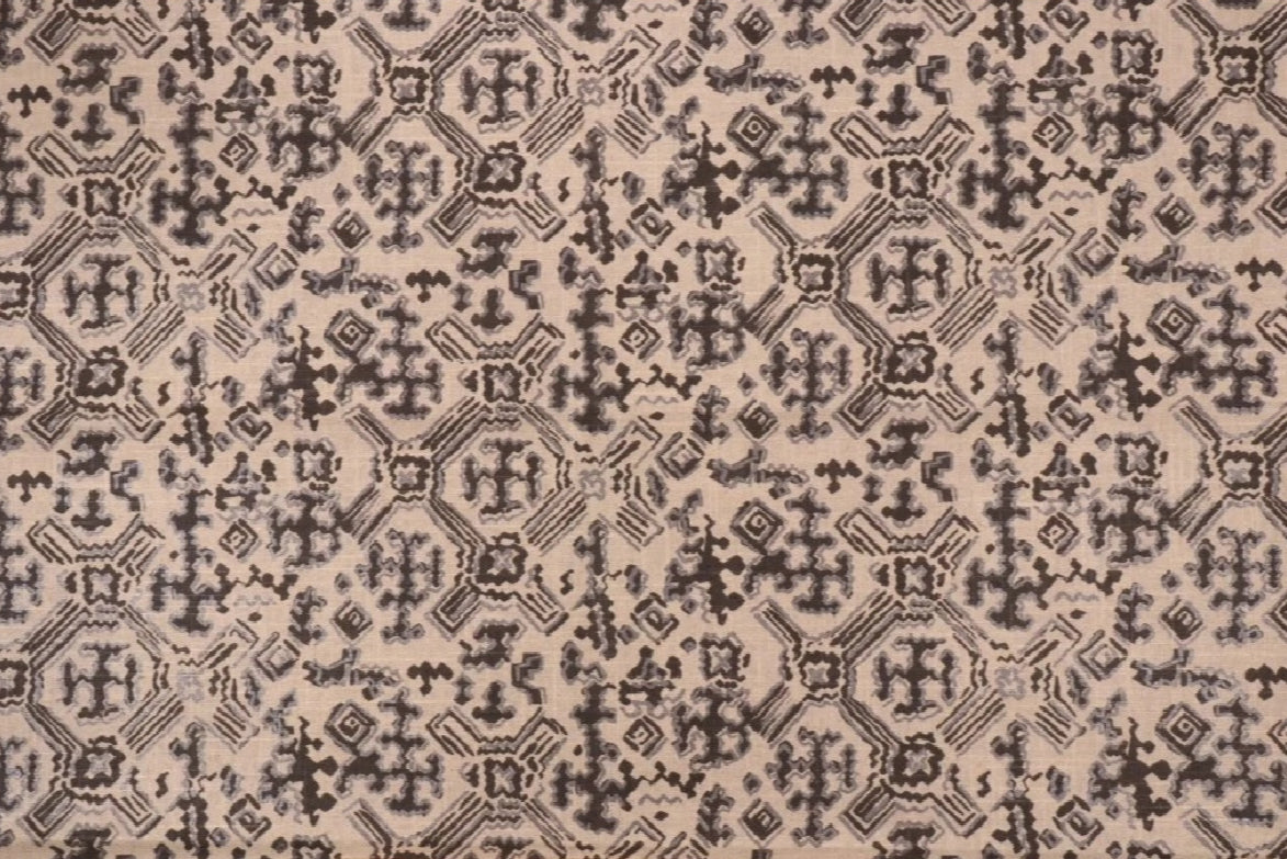 DESCRIPTION: Lacefield Designs Nomad-Ashby Fabric in Granite features a geometric pattern printed on a linen-colored base. The design features abstract, small-scale geometric shapes and lines in shades of dark brown and light grey. Rayon is added to linen to provide characteristics that linen lacks, such as a soft feel and a fluid, luxurious drape, while still retaining linen's breathability and strength. The blend offers a balance between linen's structured durability and rayon's softness and movement, making for a fabric that is more comfortable, less prone to extreme wrinkling.