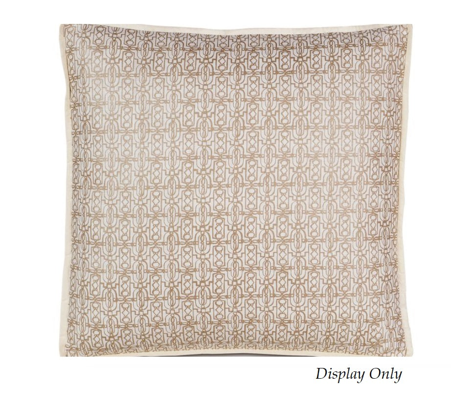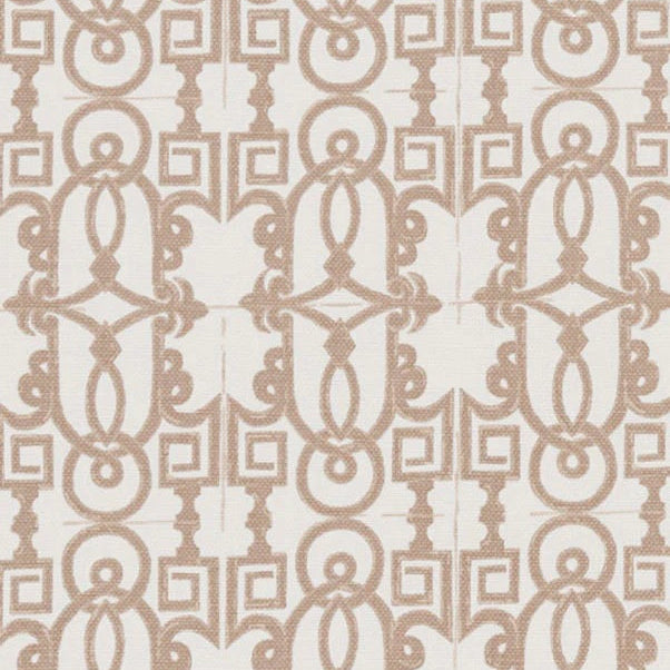 DESCRIPTION: Lacefield Designs Sevielle Fabric in Camel features a repeating geometric pattern with interlocking loops and square shapes in a tan color on a lighter, off-white background.