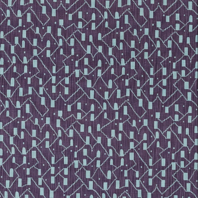 DESCRIPTION: Lacefield Designs Tunisia Woven Fabric in Ocean featuring a repeating geometric pattern in plum and teal. The texture with visible threads gives the fabric textured feel.