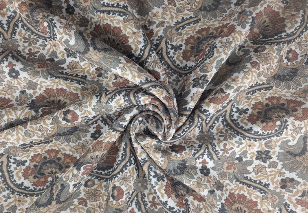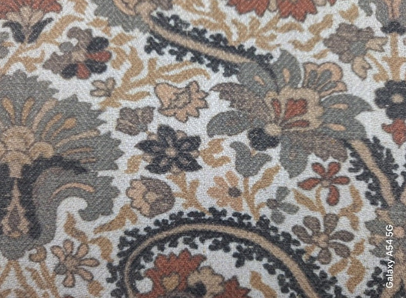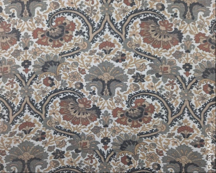 DESCRIPTION: Kelmscott Manor Fabric in Cardomom features a highly detailed and symmetrical, featuring a central medallion-like element with floral motifs and stylized boteh shapes. The design includes scrolling arabesques and flowering branches. The color palette is earthy tones, including shades of brown, beige, and gray, with accents of dark brown on a natural colored, herringbone woven background fabric.