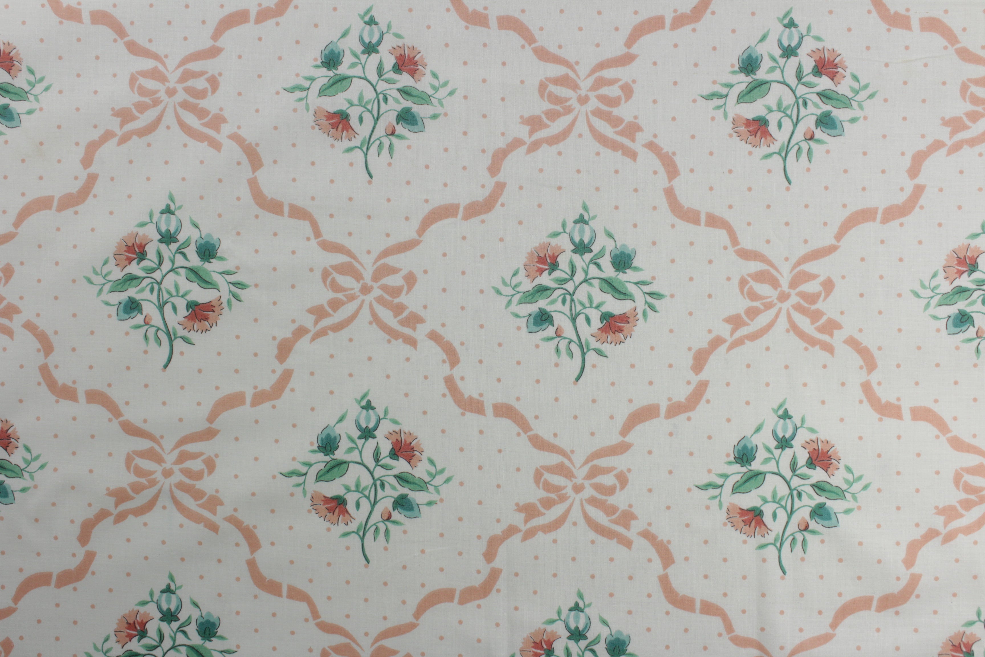 DESCRIPTION: Vintage Schumacher/Waverly Ribbons N Bows Quilting Fabric in Peach is a true vintage find. From the Cutting Garden Collection, Ribbons N Bows Quilting Fabric in Peach features a repeating pattern of peach dots on a white background. Other elements of the pattern are a trellis-like design made of peach-colored ribbons, tied into bows at the intersections, and bouquets of flowers with peach, pale green, and apricot tones are centered within the trellis.
