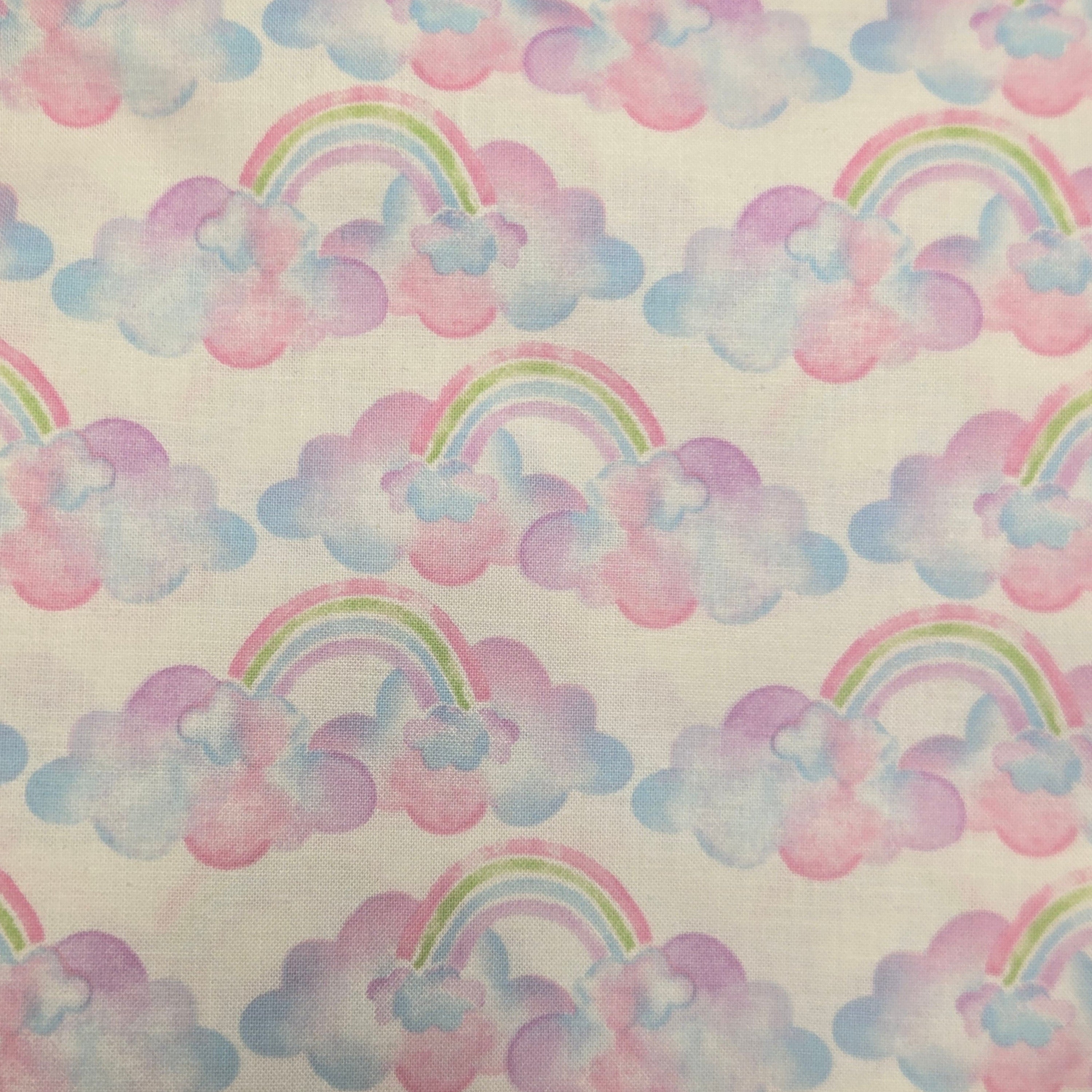 DESCRIPTION: Rainbow Quilting Fabric in Pink features a repeating pattern of watercolor-style clouds and rainbows on a white colored background.