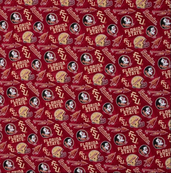 DESCRIPTION: This fabric is an officially licensed, 100% cotton print featuring the logos and colors of FSU. The design has an allover, repeating pattern on a garnet red background. The motifs celebrate the university and include various emblems and phrases. The primary colors are the team's official colors of garnet, gold, black and white.