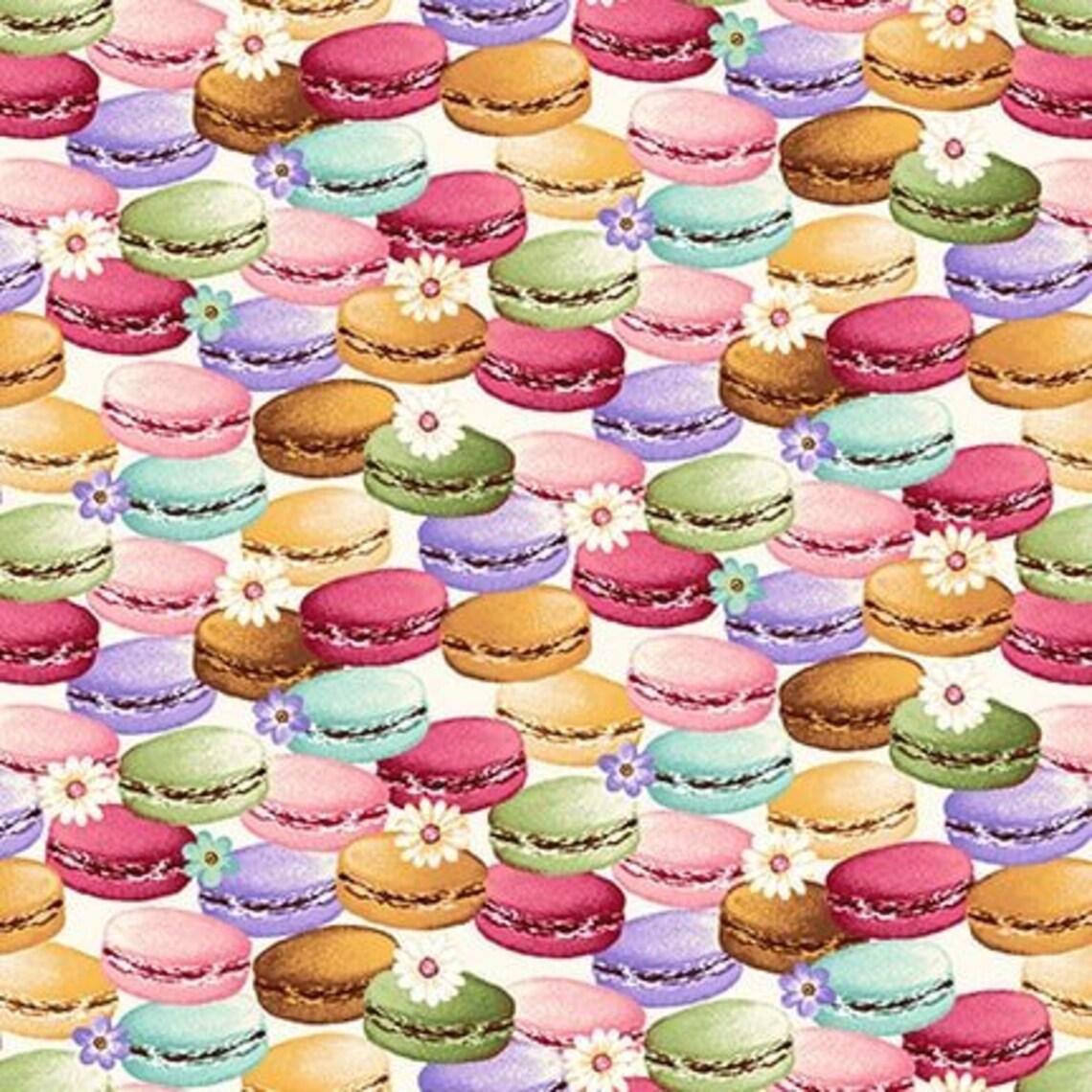 DESCRIPTION: Macaroons Quilting Fabric in Multi by Bella Coco Studios for Henry Glass & Co features a repeating pattern of colorful macarons and small white flowers with yellow centers on a light, cream background.