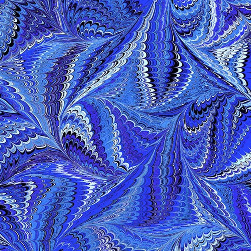 DESCRIPTION: In The Beginning Fabrics Marble Essence Quilting Fabric in Blue features a detailed marbled design primarily in shades of blue, including royal blue, light blue, and white, with hints of black for contrast and depth. The pattern exhibits a flowing, organic quality reminiscent of traditional paper marbling techniques, often described as having an Italian flair.