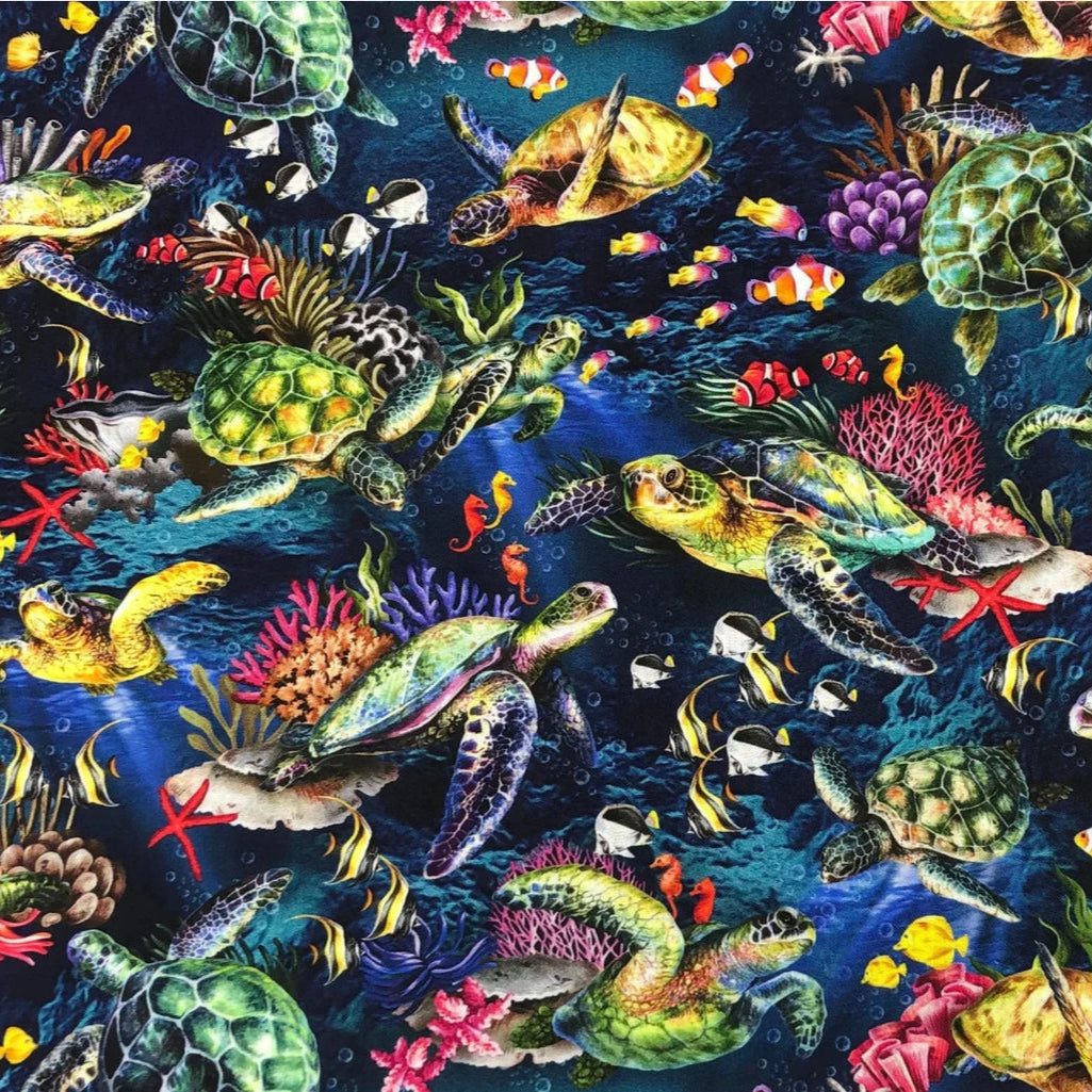 DESCRIPTION: Oasis Fabrics Sea Turtles Quilting Fabric in Dark Blue features a lively marine environment, prominently featuring sea turtles of various sizes and shades of green and yellow. The design also includes colorful coral formations in reds, oranges, and purples, along with various small fish in orange, yellow, and white, and starfish.