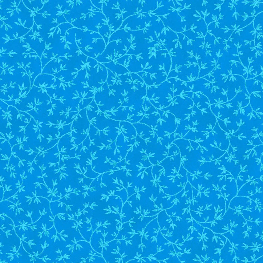 DESCRIPTION: From Stof's Quilters Coordinates Collection, Leaf Vines features a tone-on-tone design with a pattern of delicate leafy vines on a cerulean blue background.
