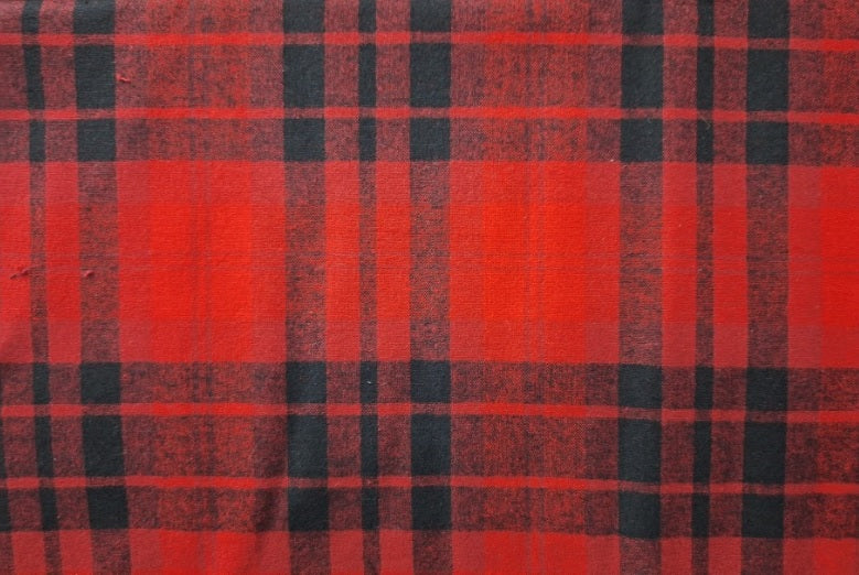 DESCRIPTION: Wide Tartan Flannel Fabric in Red is a woven plaid, flannel fabric featuring a classic tartan-style pattern in red and black.