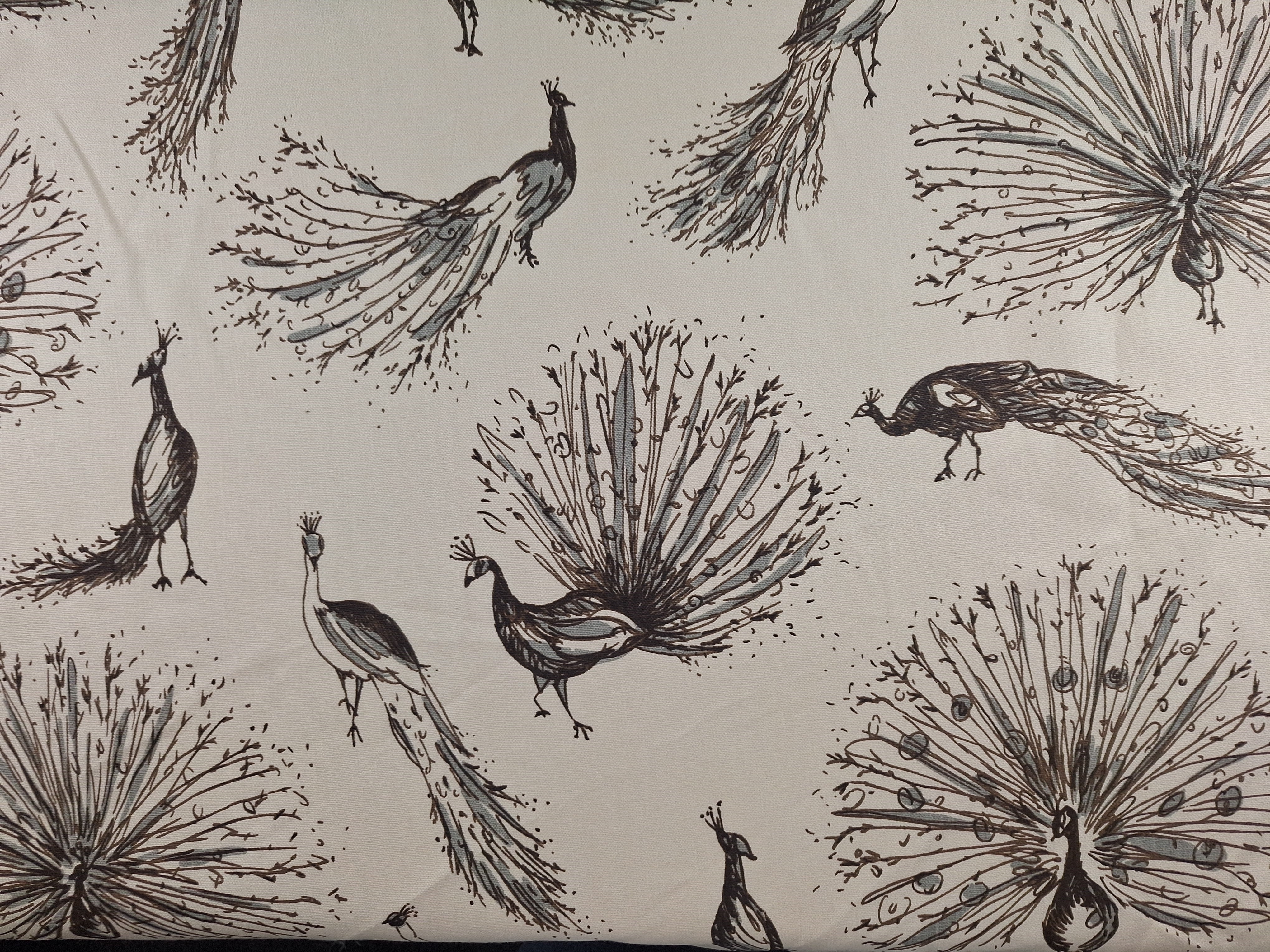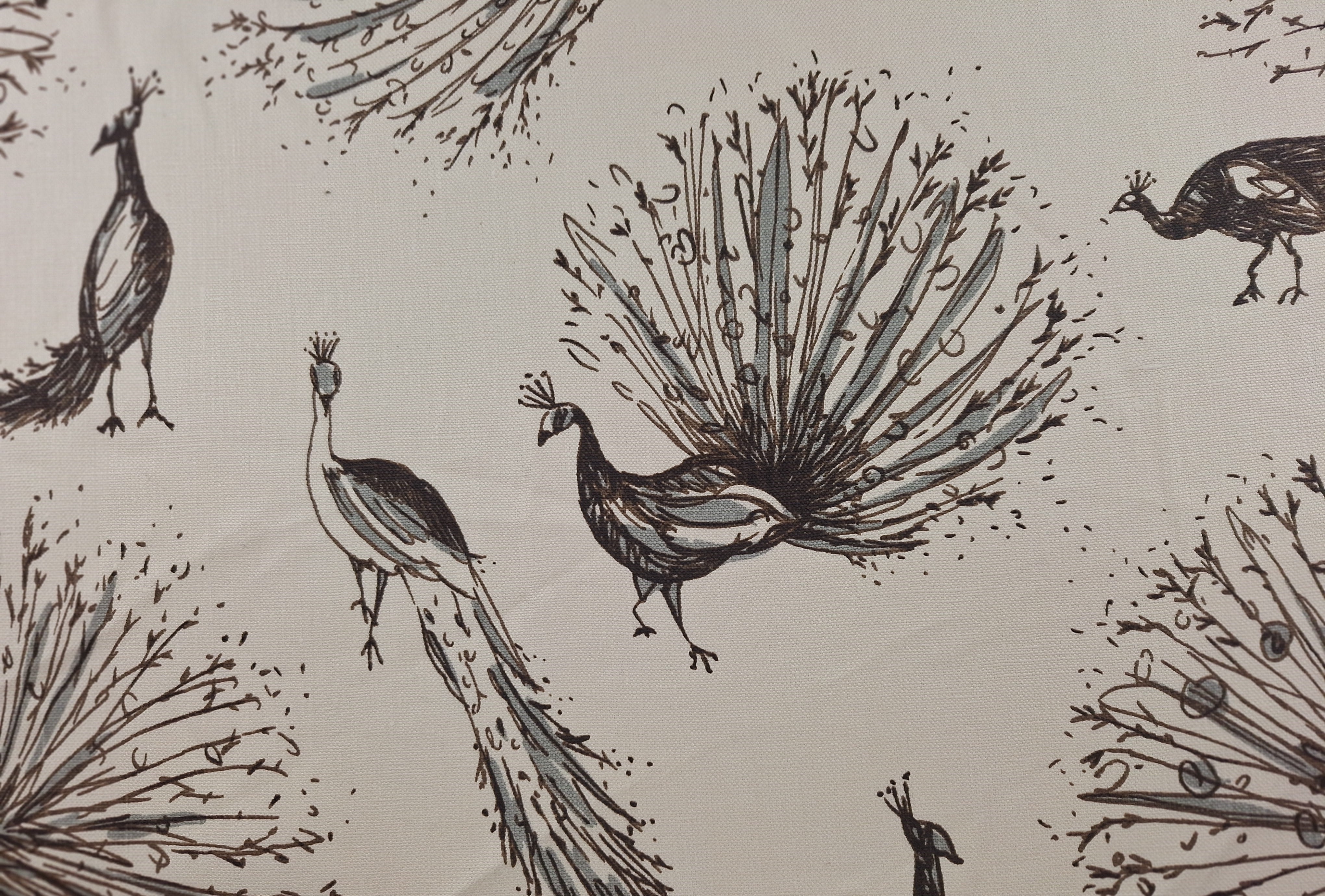 DESCRIPTION: Add an artist’s touch to your décor with interior designer Laura Kirar's artwork, Peacock fabric on 100% Linen. The color registration shows grey and brown on cream colored linen fabric. The fabric has been treaded to be soil/stain repellent.