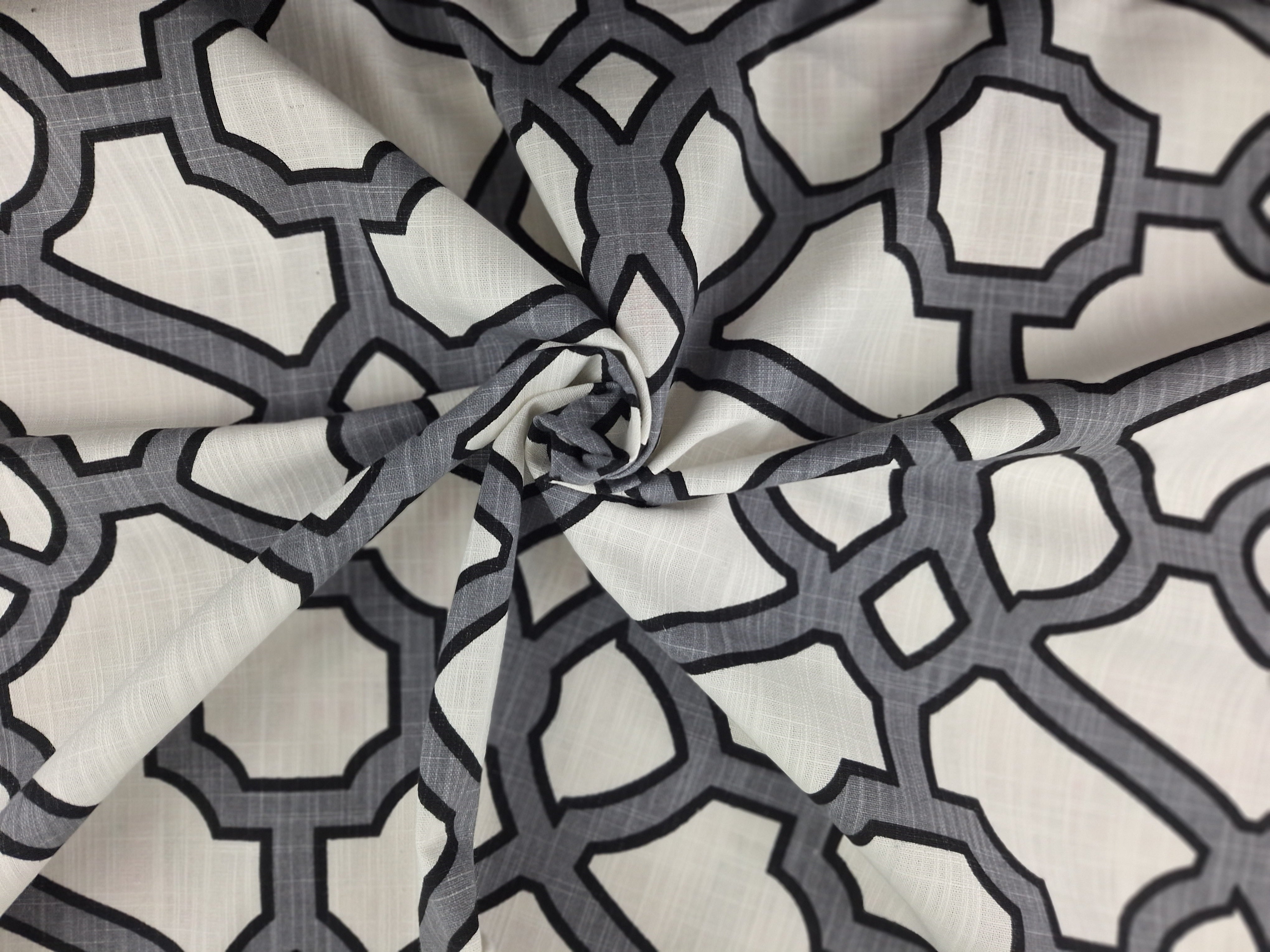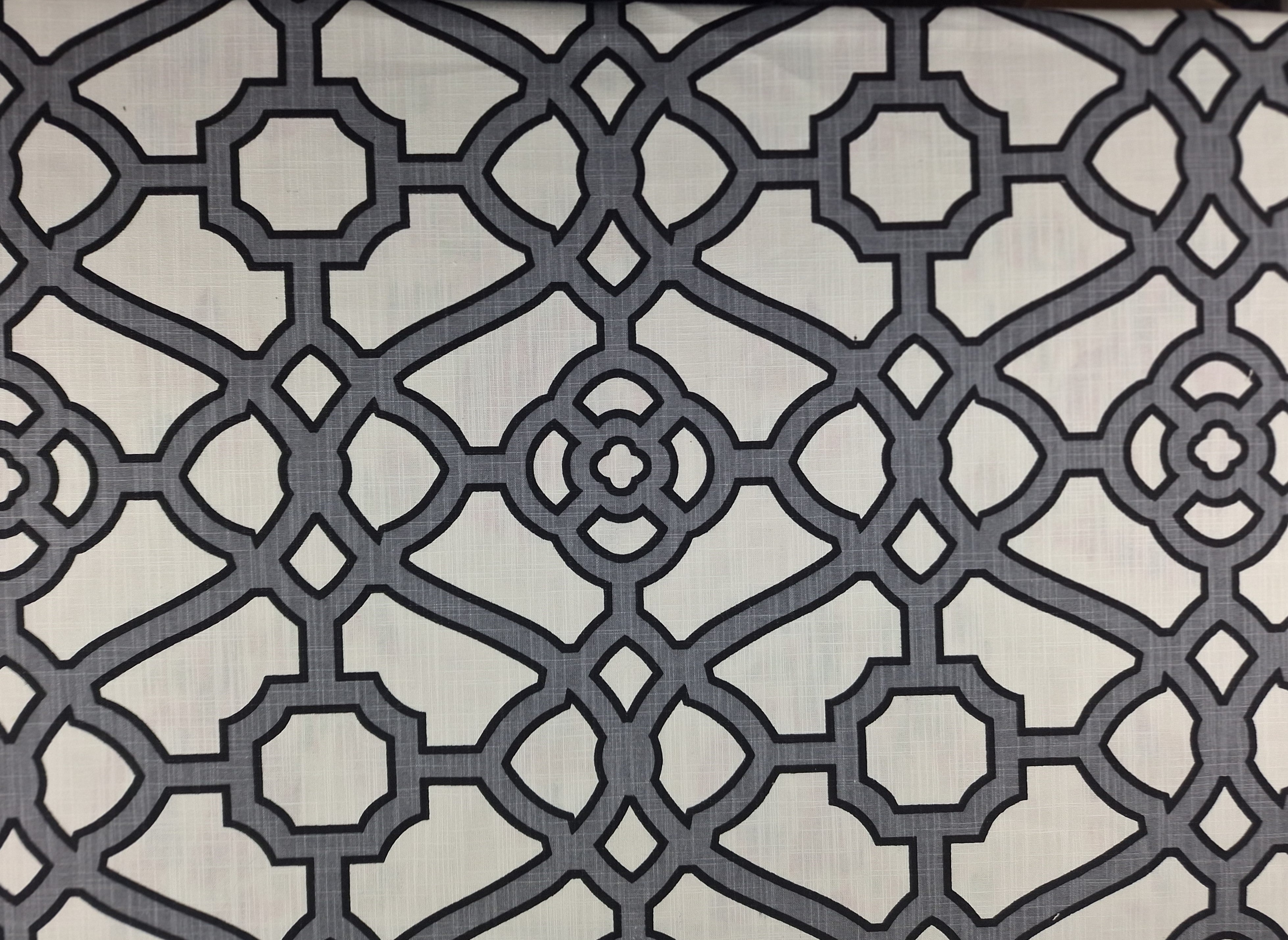 DESCRIPTION: Pavilion Fretwork fabric features an intricate, ornamental design inspired by geometric lattice patterns with interlacing or scrollwork. The color registration shows a dark shade of grey design on an-off-white fabric.