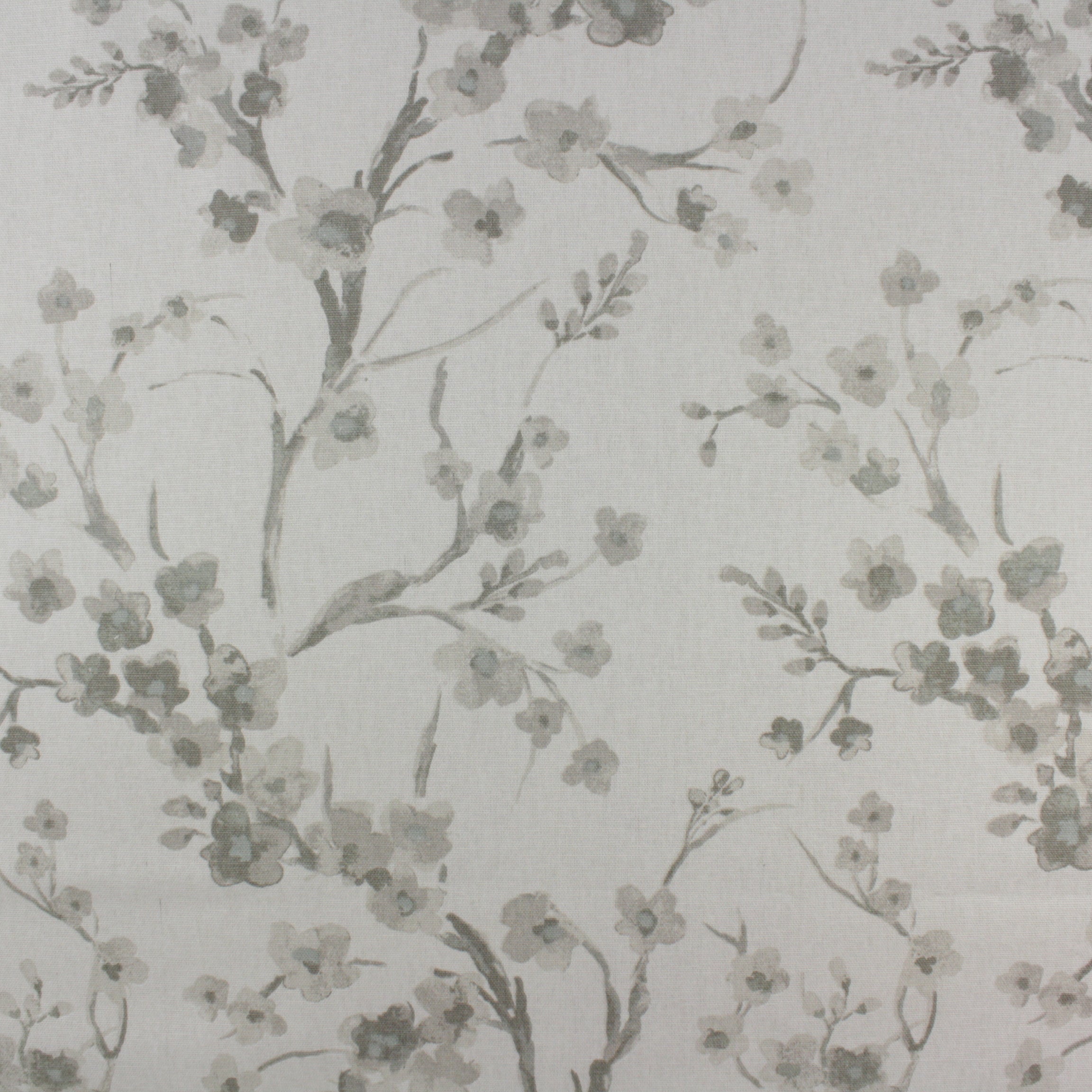 DESCRIPTION: This multi use print fabric in cotton features a oriental flowers on branches design. The color registration shows three shades of grey and 3 shades of taupe on a dark cream background.