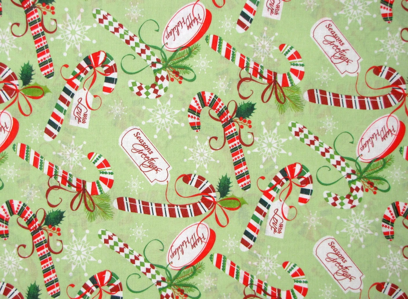 DESCRIPTION: Christmas Happy Holidays Candy Cane Toss Quilting Fabric in Green features a festive pattern with red and white striped candy canes, some of which are tied with red bows and accented with holly and evergreen sprigs. White snowflakes are scattered across the light green background. Various text elements like "Seasons Greetings" and "With Love" are incorporated into the design.