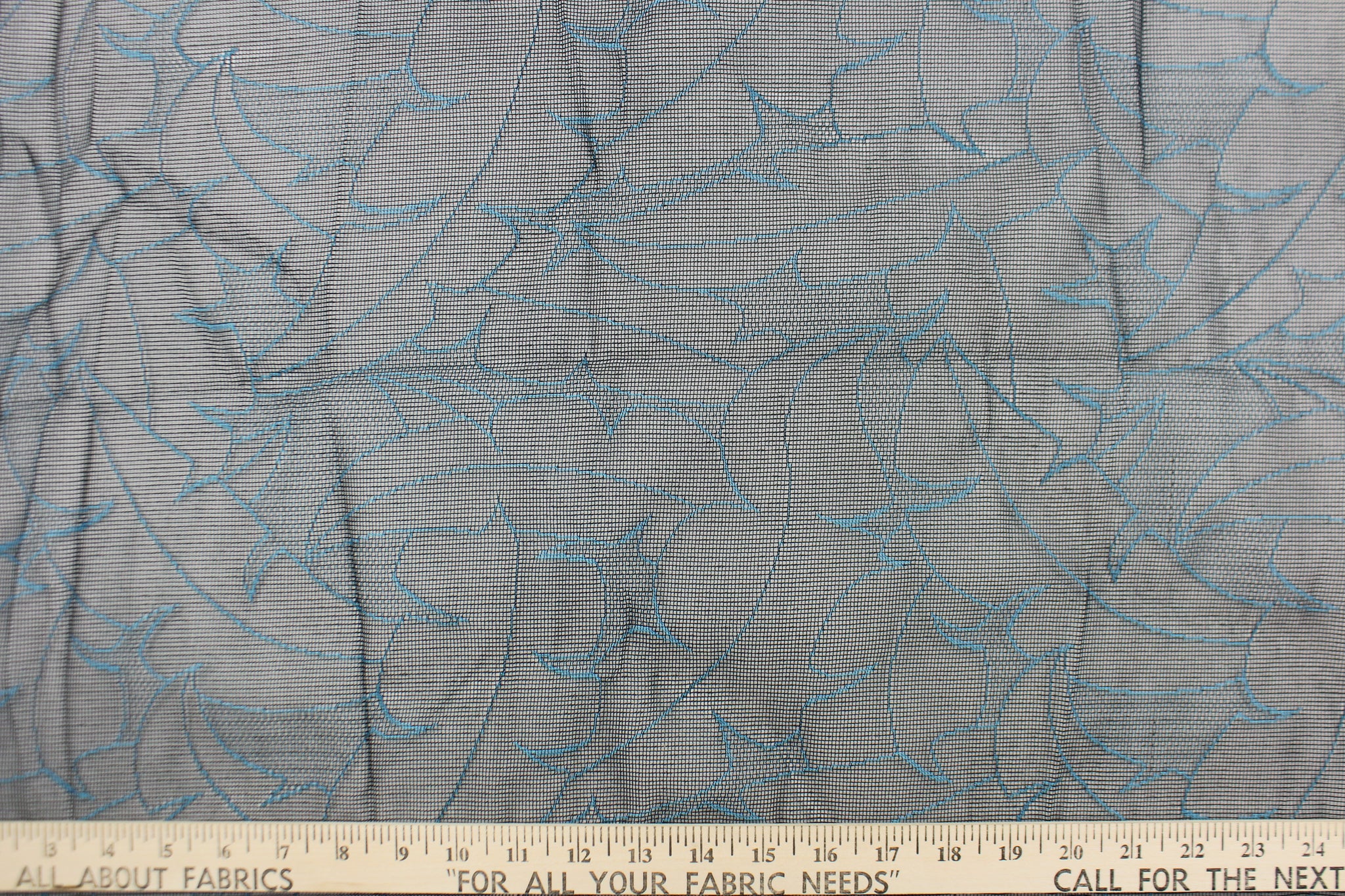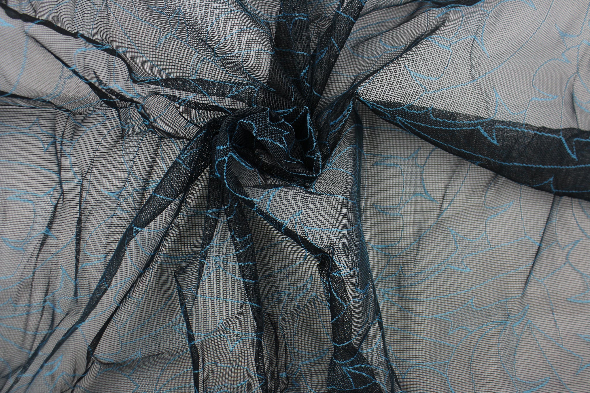 DESCRIPTION: This lace features a unique design in a blue color against a black background. It is sheer and breathable with a nice soft drape. Use this for apparel, overlays, dancewear, costumes, and special events decor. We offer a wide variety of lace fabric.