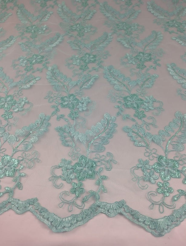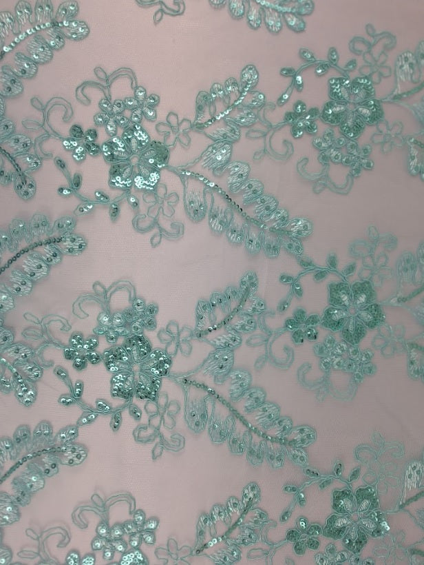 DESCRIPTION:  Julia Delicate Embroidered Lace Fabric in Turquoise features an ornate, elaborate floral and leaf pattern with textural motifs. The design includes detailed threadwork that forms the main patterns, Shimmering sequins are lavishly applied throughout the design, adding depth and sparkle. The motifs has a raised, almost ribbon-like texture, the net backing is soft, which ensures a beautiful drape, and the edges are scalloped.