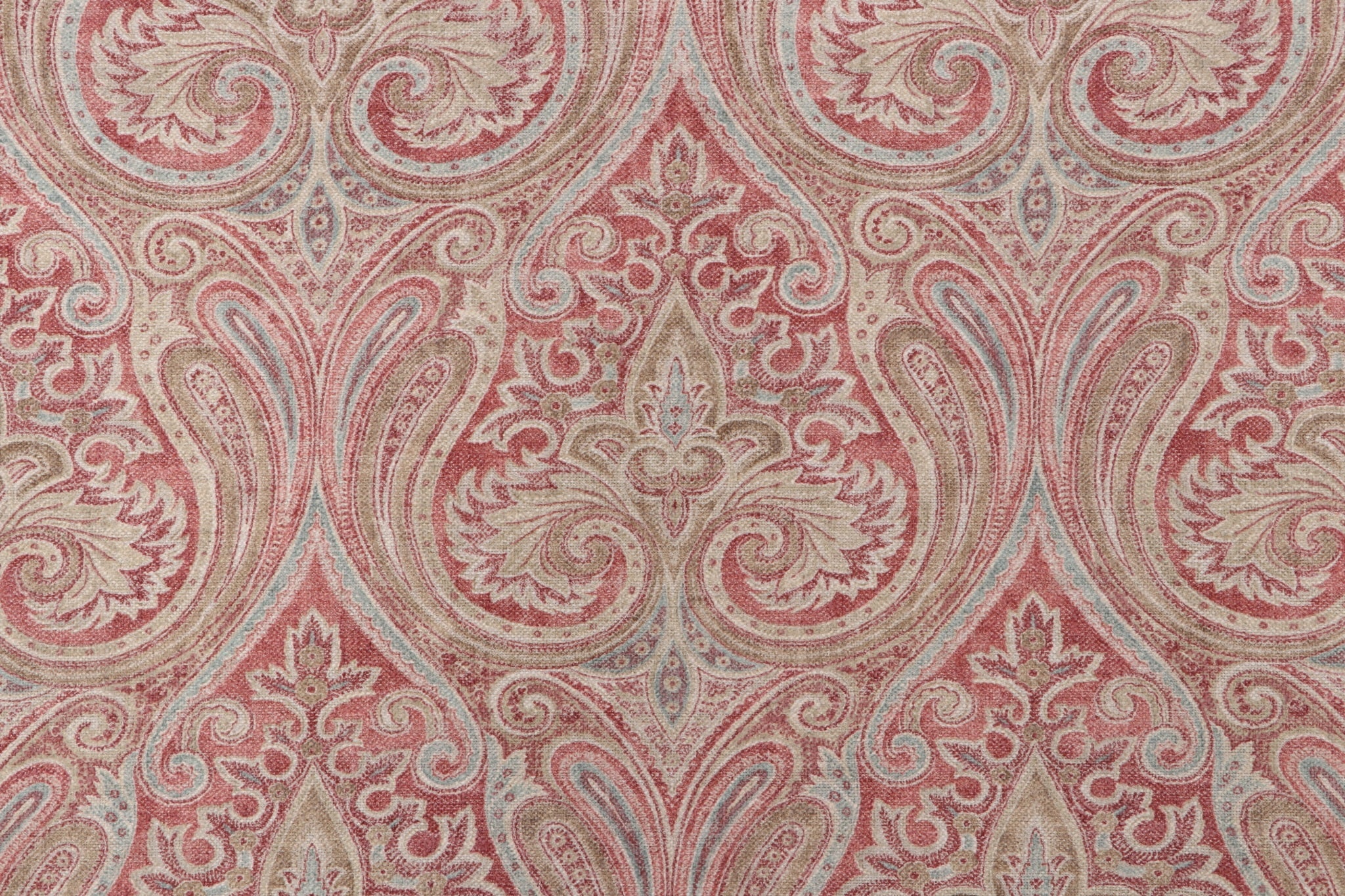 DESCRIPTION: Waverly's Quiet Place in Rouge is from the Waverly Centennial Collection. Timeless and classic, paisley fabric is an ornamental textile design that features the famous teardrop-shaped motifs dating back centuries to the Persian dynasties. The color registration shows the colors dark rose, cocoa, and sand with accents of spa blue.