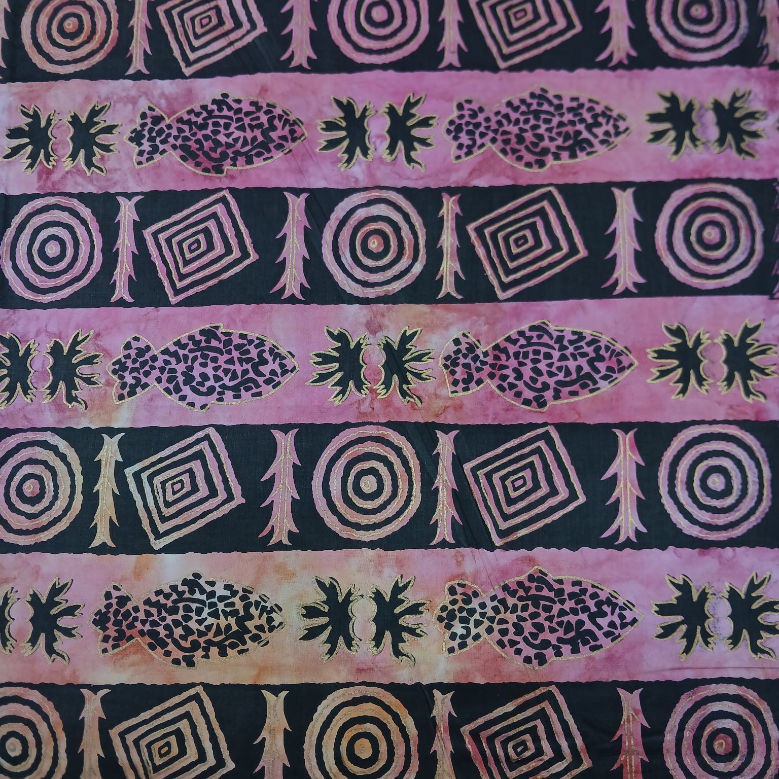 DESCRIPTION: Marcus Fabrics Batik Quilting Fabric in Sunset features a patterned design with alternating horizontal bands of two distinct motifs on a pink and black background.