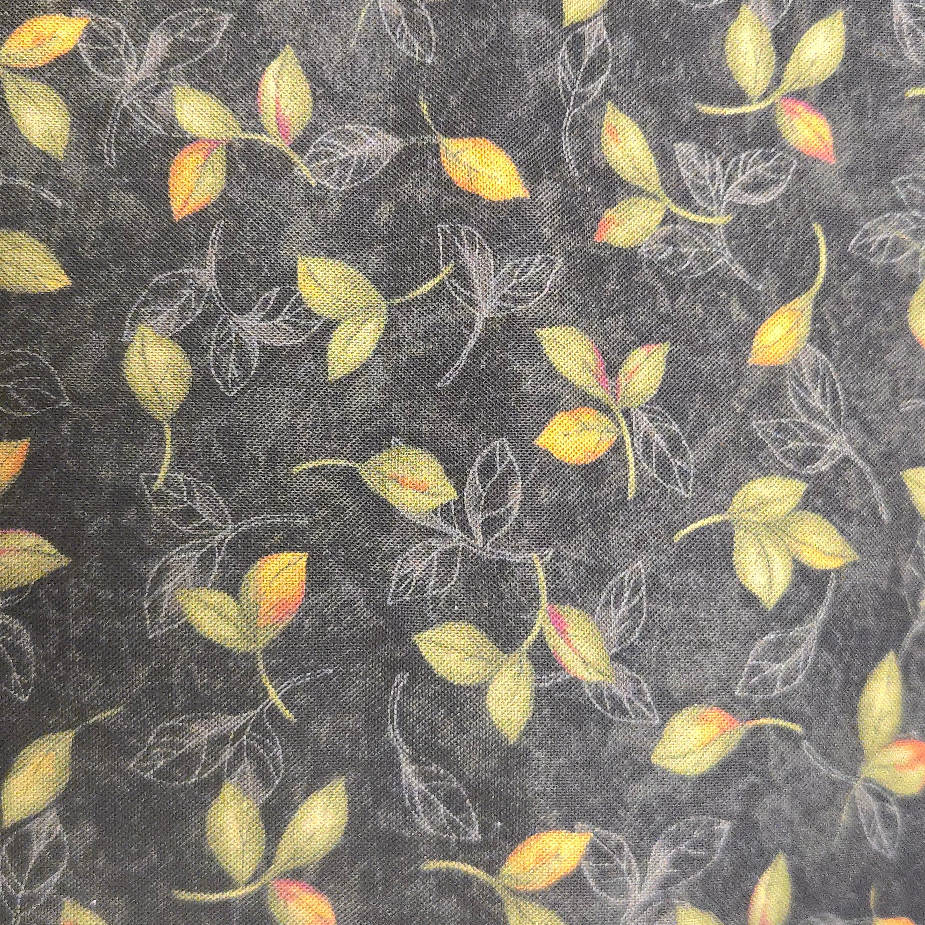 DESCRIPTION: Marcus Fabrics, Studio 37 Falling Quilting Fabric in Charcoal features a dark, deep charcoal background with a scattered pattern of leaves. Leaves are depicted in shades of yellow, green and orange, for an autumnal or warm-toned palette.