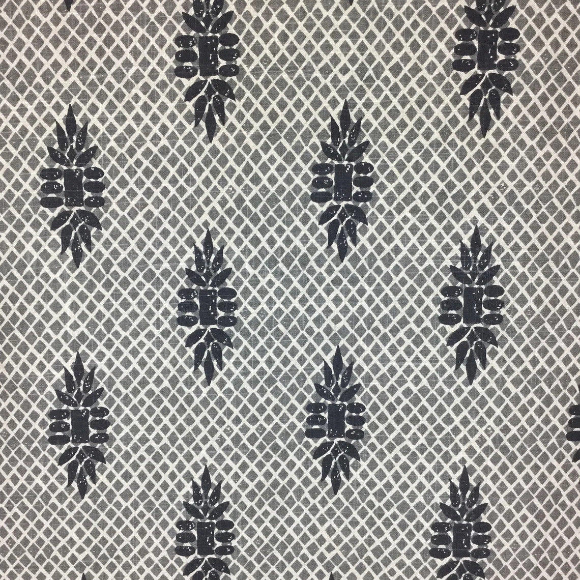 DESCRIPTION: Lacefield Designs Boca Fabric in Granite features a repeating, stylized medallions on a background of an imperfect diamond pattern. The medallions are black with gray diamonds on a natural colored background fabric.