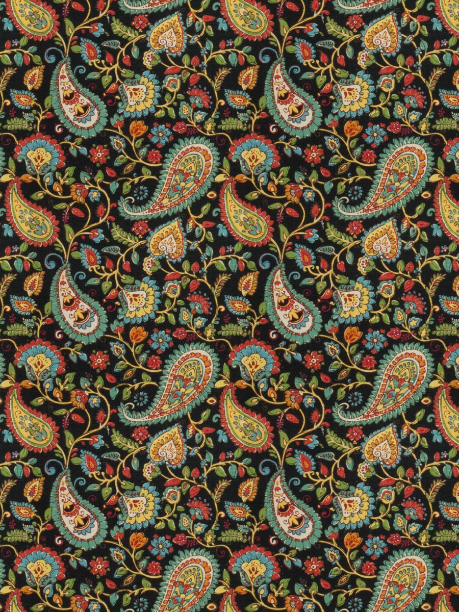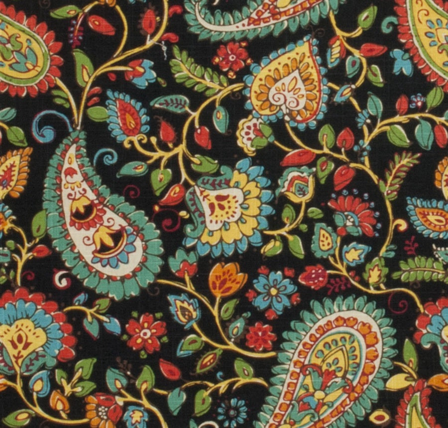 DESCRIPTION: This Famous Maker design is timeless and classic. Paisley fabric is an ornamental textile design that features the famous teardrop-shaped motifs dating back centuries to the Persian dynasties. Whether you're looking to refresh your space or add a pop of color, this fabric is the perfect choice. The color registration shows the colors red, orange, yellow, green, teal and white on a black background.