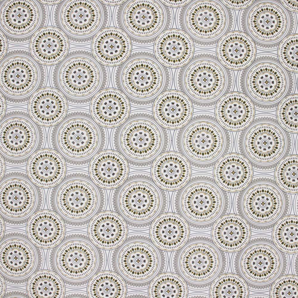 DESCRIPTION: Headline Event in Gold features a repeating geometric design composed of large, interlocking circles. Each circle contains intricate details, including smaller concentric circles and patterns within, creating a textured and layered appearance. The color registration shows black, grey, tan and gold on a ivory colored background.
