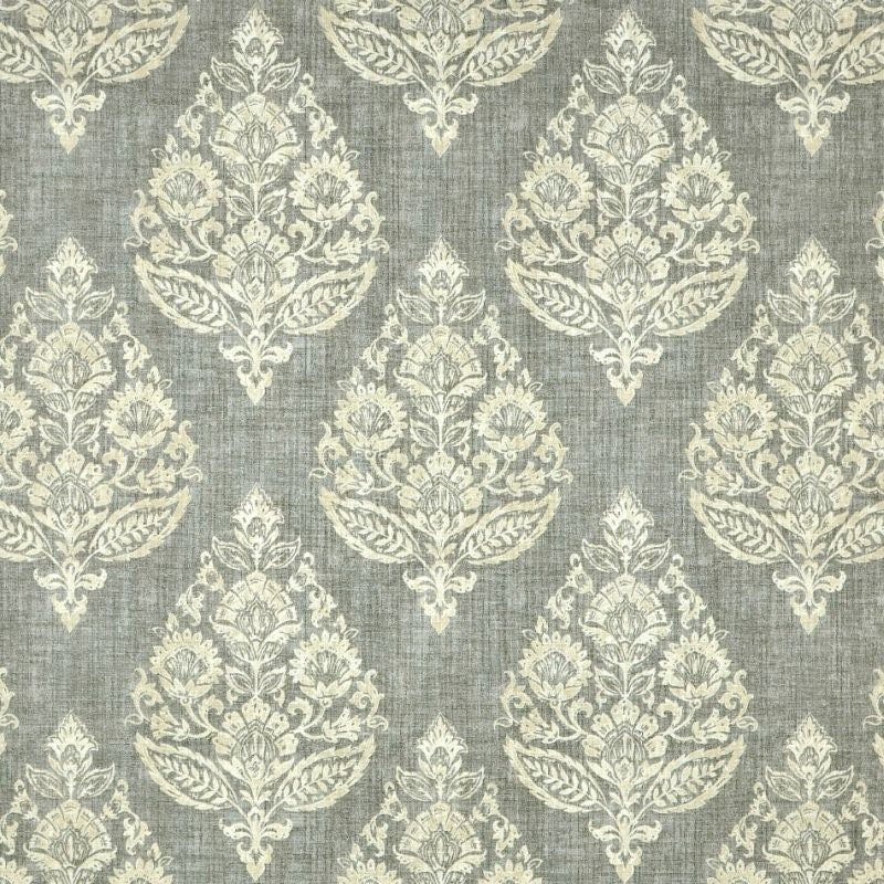 DESCRIPTION: Covington Fabrics Lydia Fabric in Stone features a repeating medallion pattern in a light sand color against a grey background. The design showcases an extravagant damask pattern with symmetrical and ornate floral motifs, presented in muted tones.