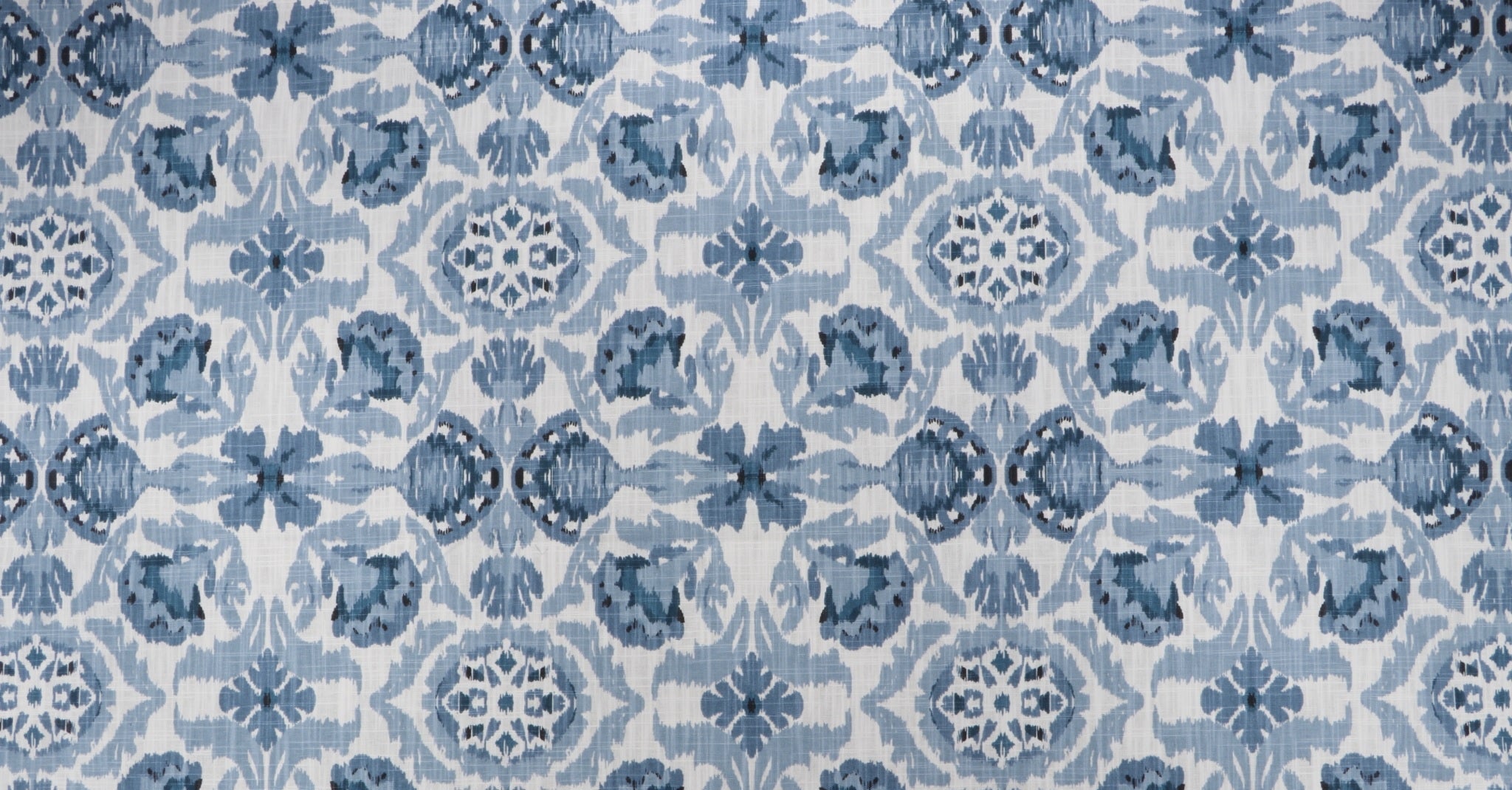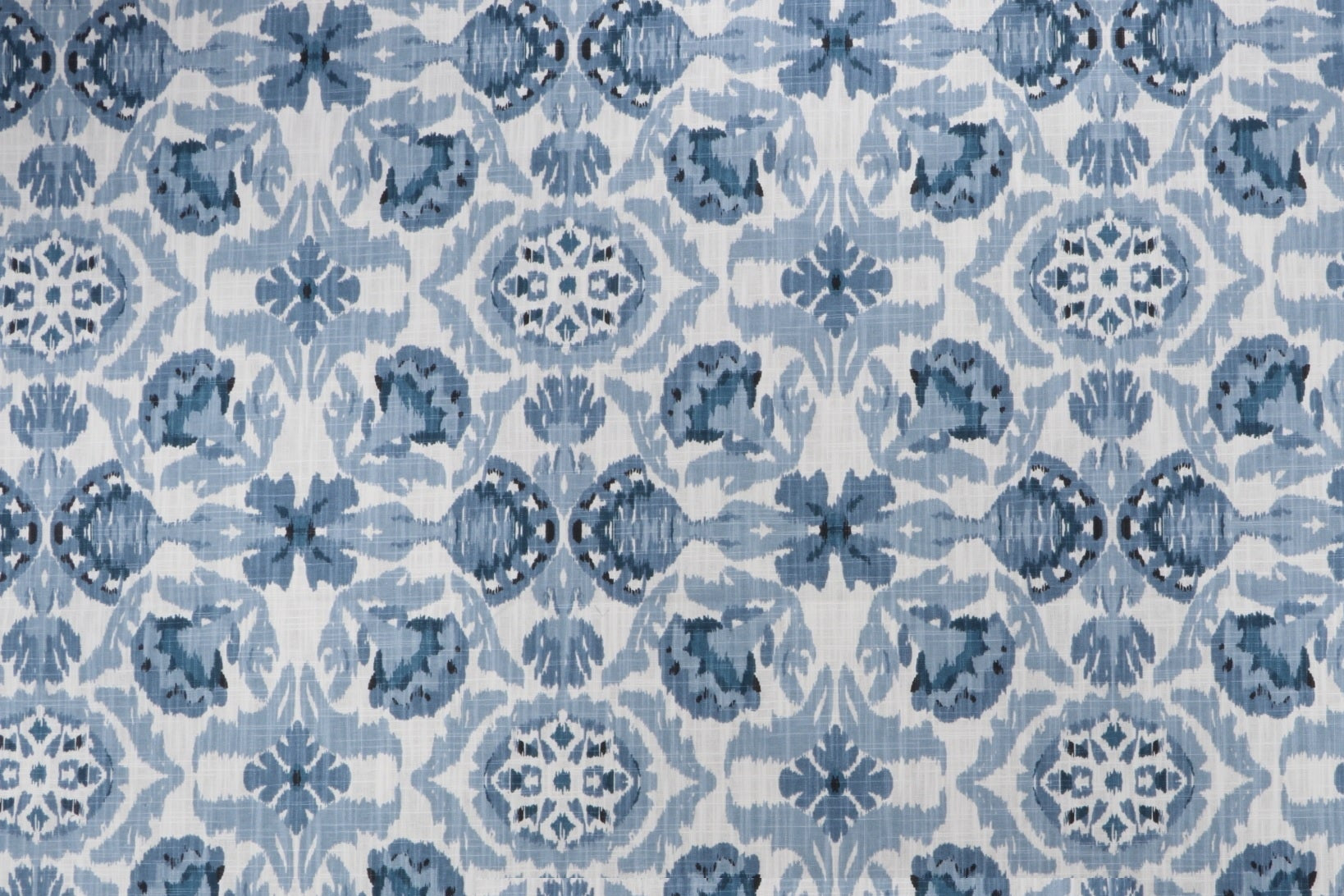 DESCRIPTION: Covington Fabrics McKenzie Fabric in 51-Denim features a pattern characterized by an Ikat-inspired design with ornate, repeating floral medallion and abstract motifs in various shades of blue against a lighter background.