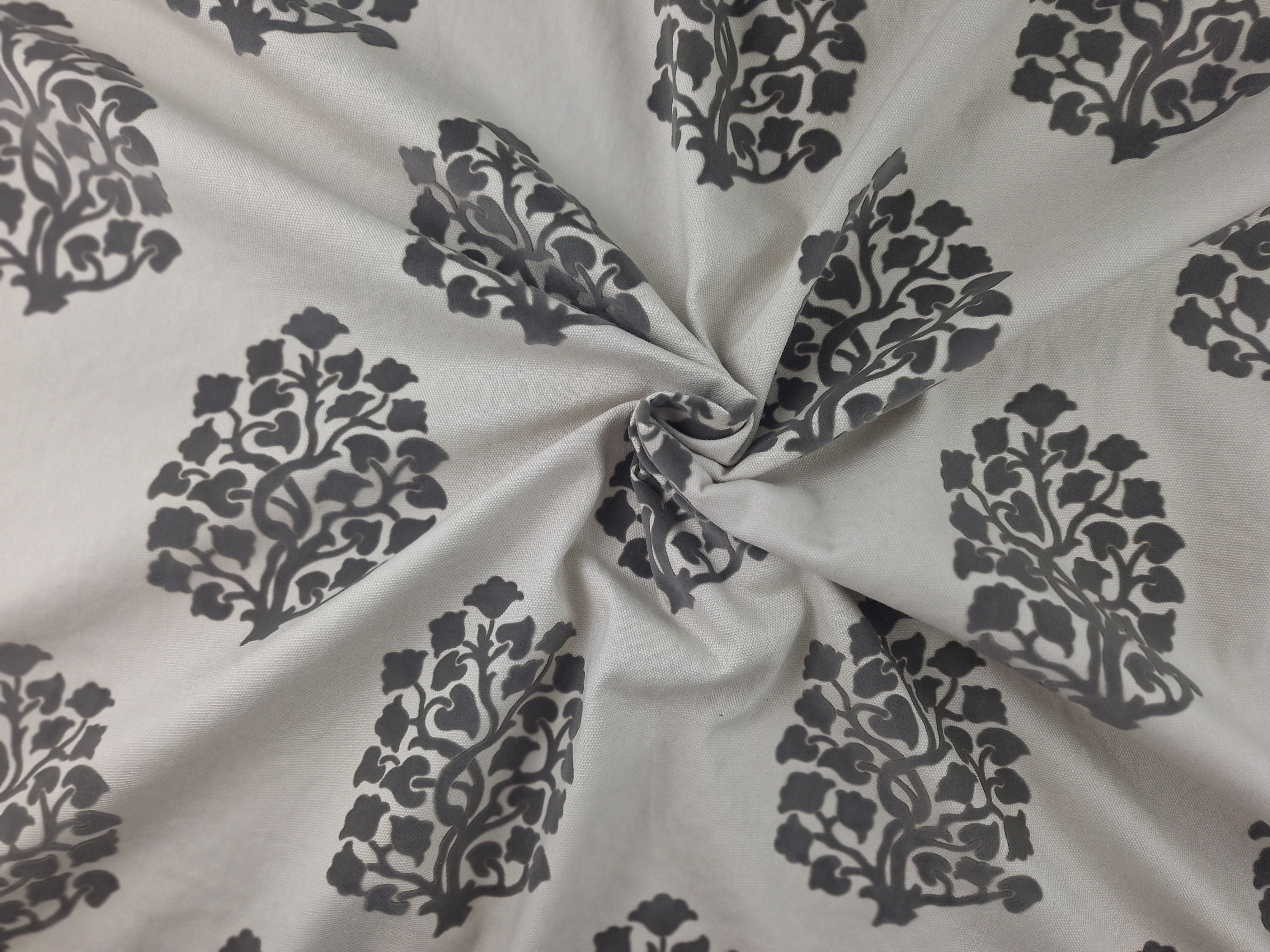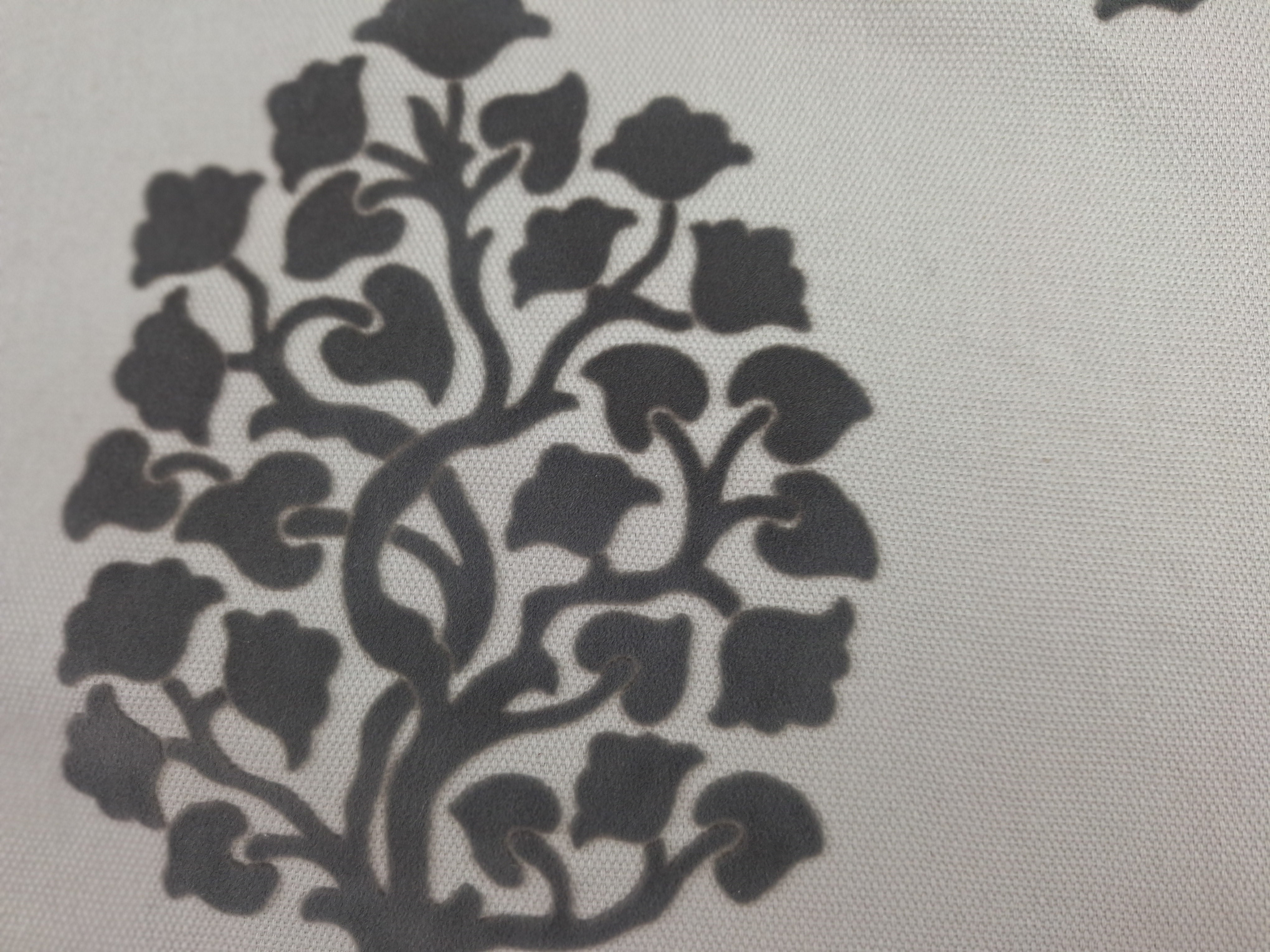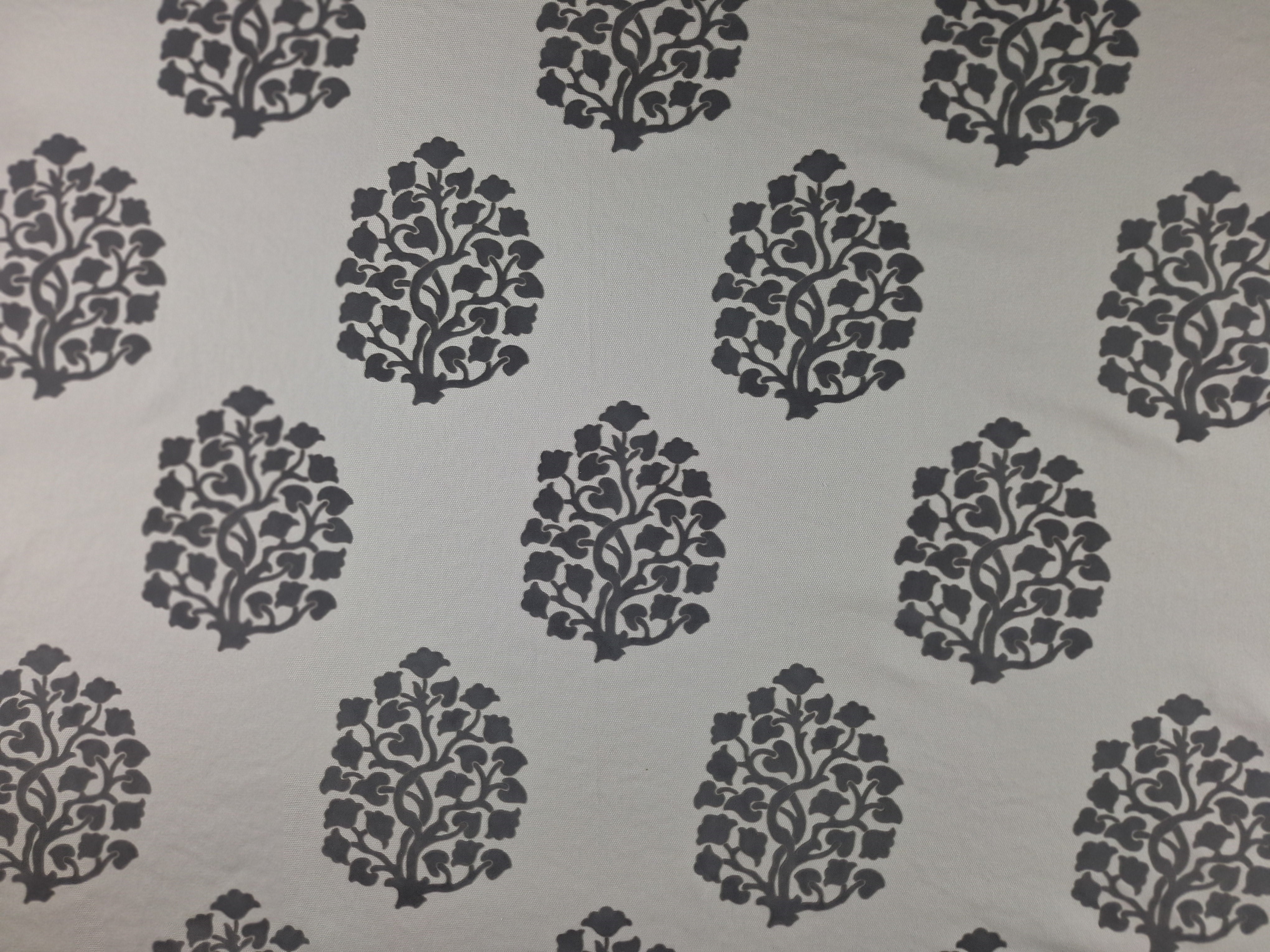 DESCRIPTION: Foliate Scroll Flocked Velvet Fabric in Dove Gray features a ornamental, spiraling or curved motif design incorporating stylized leaves, vines and other botanical elements. The base fabric is a 6 oz., 100% cotton poplin fabric in a natural colorway. Flocked textiles add a layer of texture, luxury, and warmth to home décor, creating a soft, velvety feel that engages both visual and tactile senses. Take the luxury even further by adding one of our lip, brush fridge, or tassel trims.