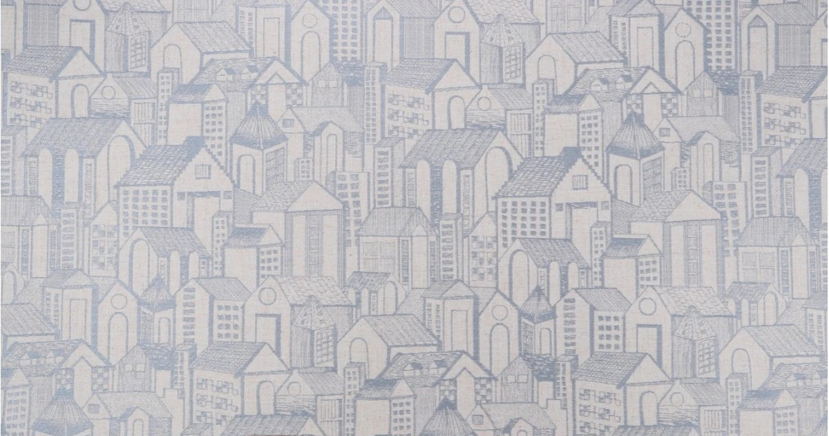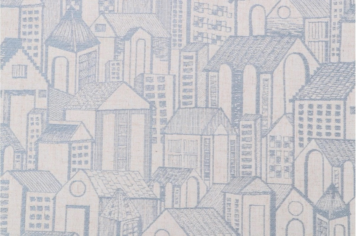 DESCRIPTION: Golding Abode Woven Jacquard Fabric in Blue Smoke features a clever and innovative design that combines geometrics with architectural details.  The pattern depicts a dense, light blue and cream cityscape with various buildings, including both houses and taller structures, rendered in a detailed, hand-drawn style.