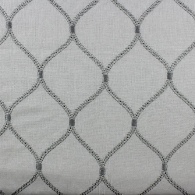 DESCRIPTION: From the Founder's Anna Elizabeth Collection, A9780 in smoke is inspired by Capri’s airy and bright Certosa di San Giacomo, a 14th-century monastery and masterpiece in the heart of the island noted for its remarkable architecture. The embroidery is in a silver colored ogee design with silver colored accents on a ivory colored fabric background. Anna Elisabeth is a collection made for interior designers who believe that fabric is not just a part of the room, but the soul of it.