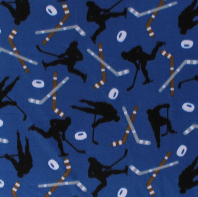 DESCRIPTION: Hockey Fleece Double Brushed Fabric in Royal features a repeating pattern of hockey players, sticks, and pucks. The fabric is a soft and plush fabric, that is cozy, warm, lightweight, and anti-pill. Get creative with this versatile fabric and show-off your DIY skills!