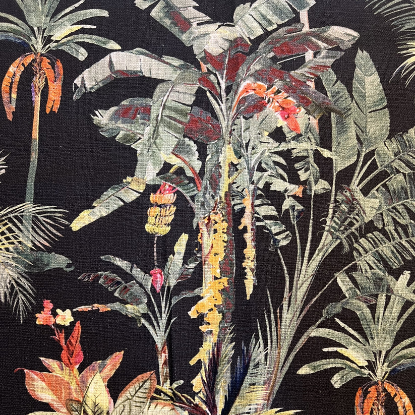 DESCRIPTION: Swavelle Mill Creek Isla Verde Marvy Jungle Fabric in Black features various tropical flora, including large palm fronds, banana leaves, and other leafy plants. There are also representations of flowering plants and hanging vines and fruit clusters. The color scheme is rich and vibrant, contrasting against the dark background. Greens and olive tones dominate the foliage, with accents of warm oranges, reds, and yellows for the flowers and some leaf details. Some elements also incorporate lighter, almost white or pale grey tones, providing depth and texture.