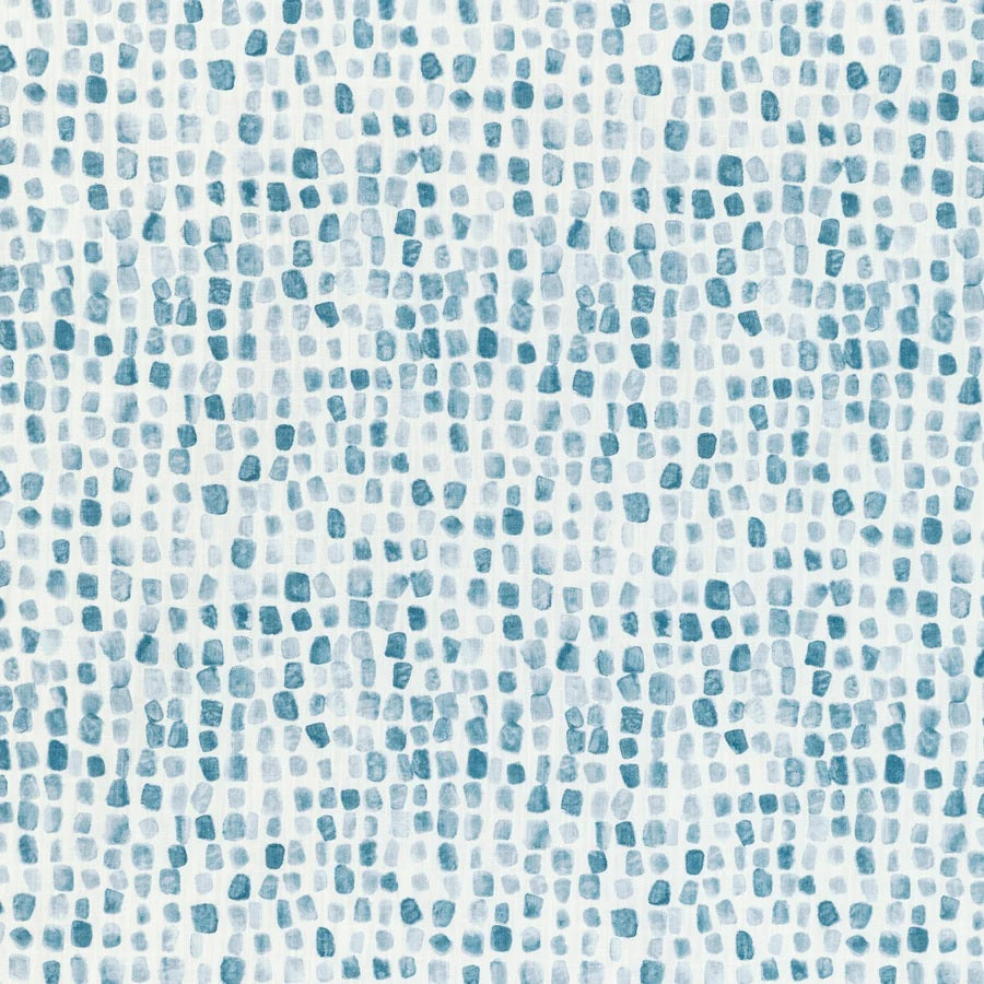 DESCRIPTION: Kravet Shodo Path Fabric in Cerulean features a design reminiscent of traditional mosaics or cobblestones, composed of numerous small, irregular, rectangular or tile-like shapes. with a watercolor or brush-stroke finish, providing an artistic and textural flair. The colors are rich blues, including navy and indigo tones, set against a white or off-white background.