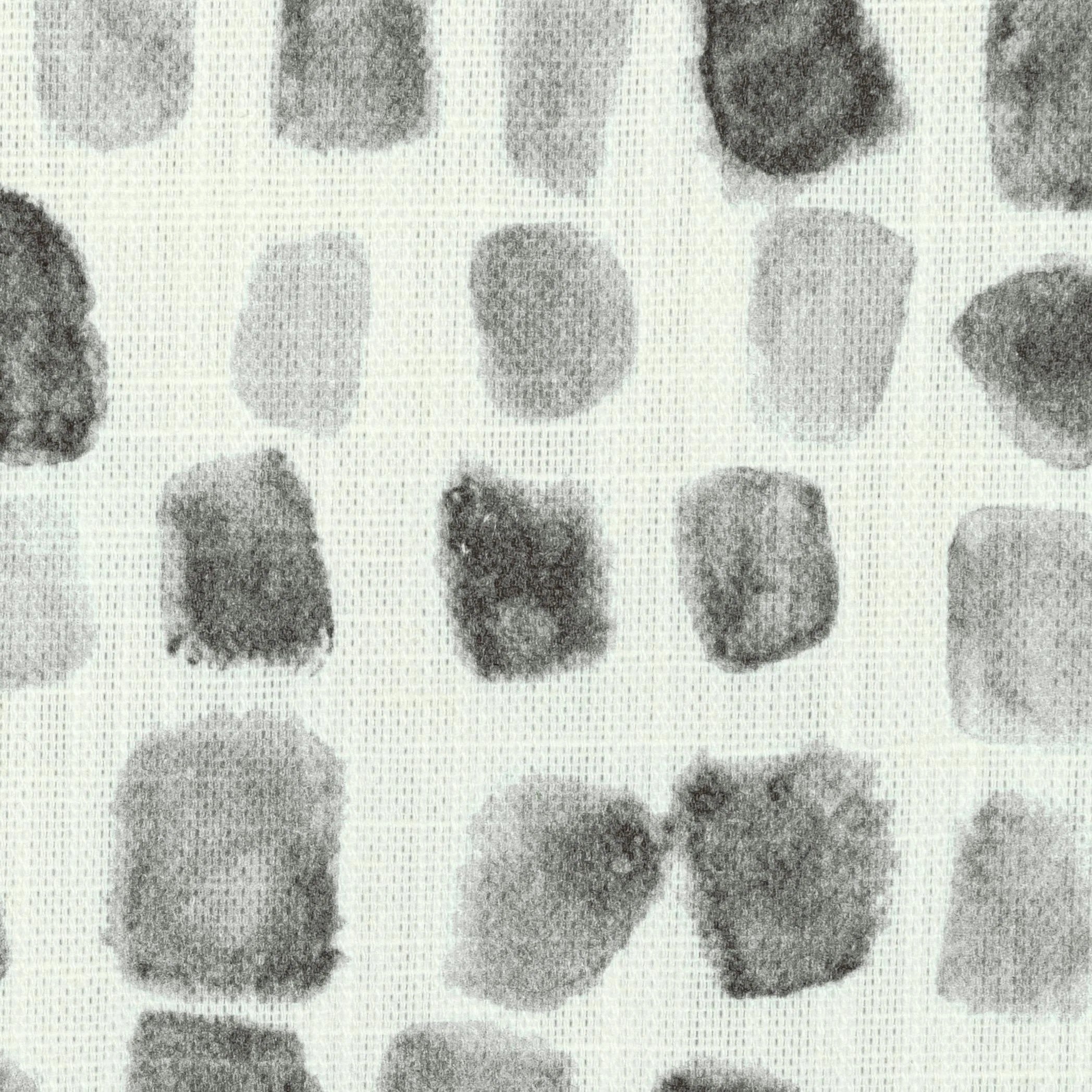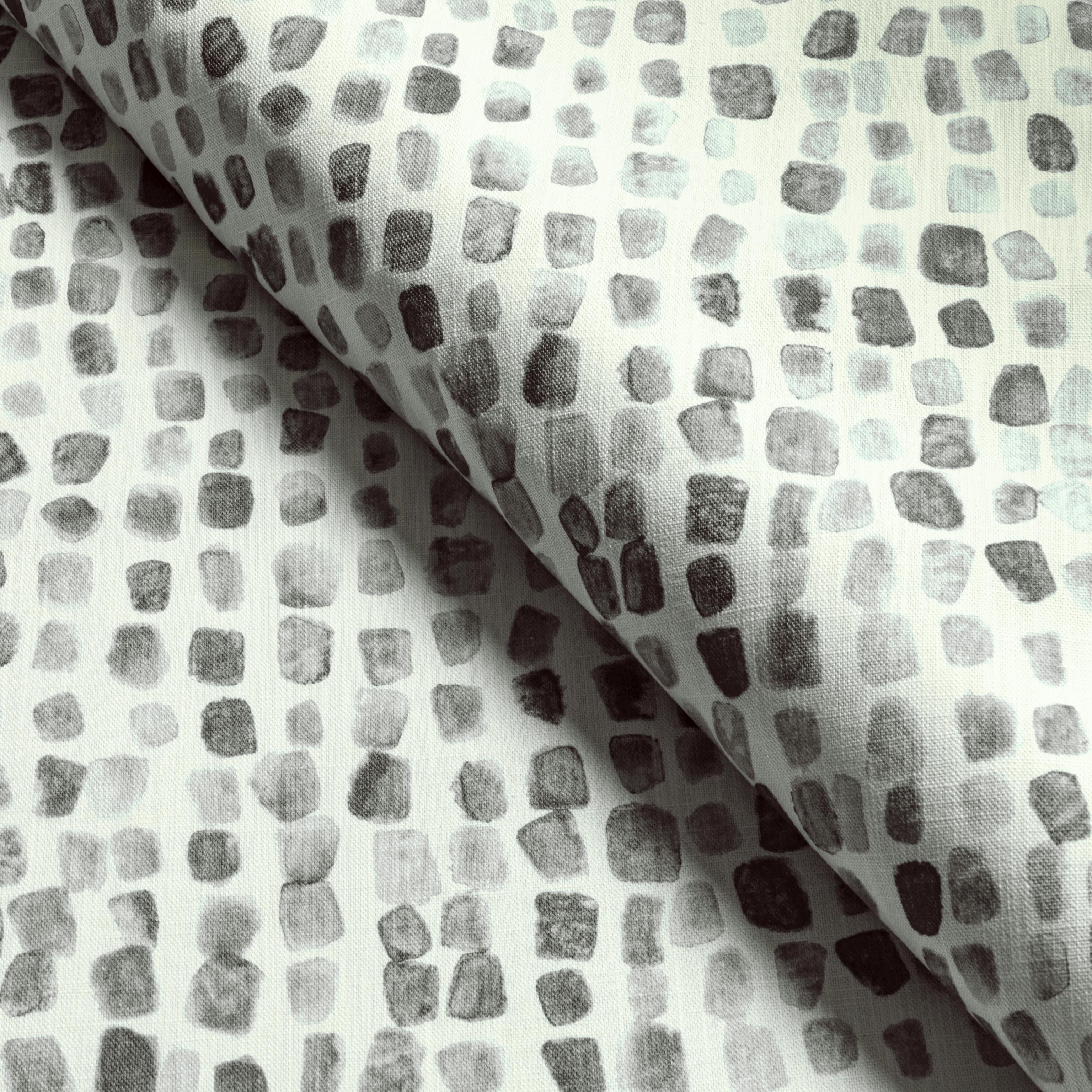 DESCRIPTION: Kravet Shodo Path Fabric in Fog features a design reminiscent of traditional mosaics or cobblestones, composed of numerous small, irregular, rectangular or tile-like shapes. with a watercolor or brush-stroke finish, providing an artistic and textural flair. The colors are shades of gray tones, set against a off-white background.