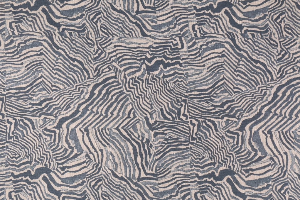 DESCRIPTION: Lacefield Designs Agate Fabric in Cadet features a complex, repeating pattern of jagged, abstract lines that resemble a stylized animal print, such as a zebra or tiger stripe. The colors are shades of blue on a natural colored fabric.