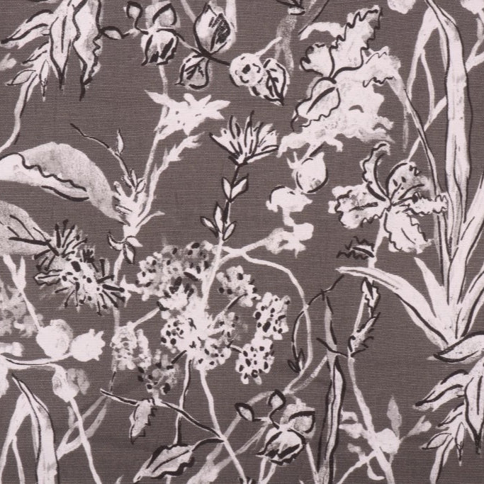 DESCRIPTION: Lacefield Designs Garden Party Fabric in Ink features a hand-painted floral pattern in shades of light gray, black, and white on a warm gray background. The design includes various flowers, vines, and foliage in a sketched, ethereal style.
