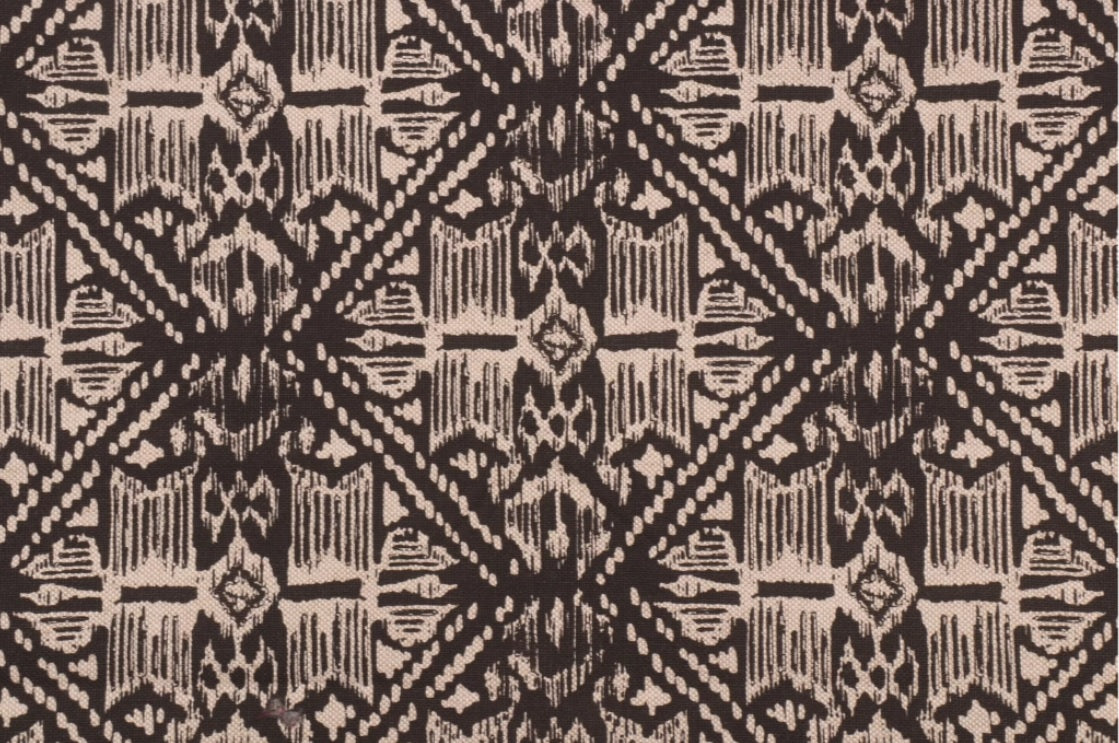 DESCRIPTION: Lacefield Designs Havana Fabric in Graphite features a printed, repeating geometric pattern with a diamond-like lattice design. The stylized motifs within the diamonds are a block print. The colors are a black on a natural color background fabric.