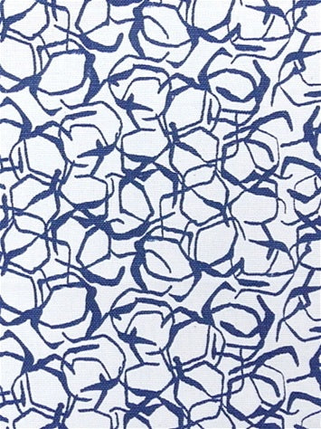 DESCRIPTION: Lacefield Designs Honeycomb Fabric in Cadet features a white background with a dark blue, geometric block print pattern. The design features a repeating, all-over pattern of connected, irregular, rounded shapes that resemble cells or stones. The lines of the pattern are thick and have a hand-drawn quality.