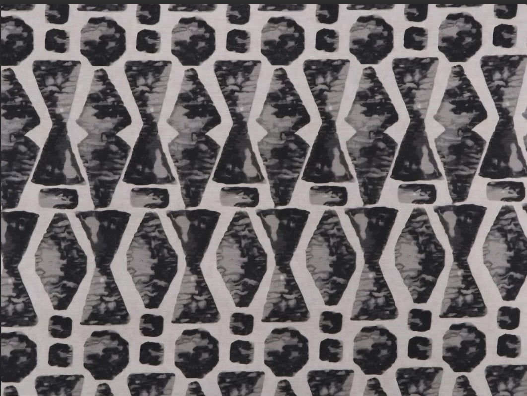 DESCRIPTION: Lacefield Designs Juju Fabric in Granite Linen features a repeating geometric pattern that includes triangles, diamond shapes, and circles. The design has a somewhat retro feel. The primary colors are black and gray on a natural background colored fabric.