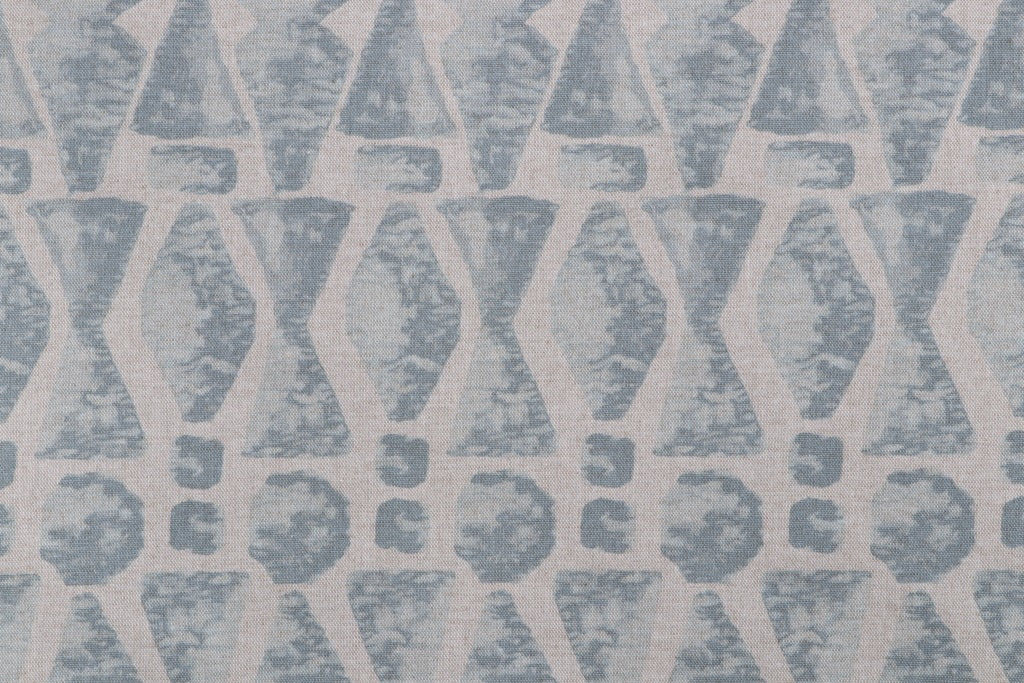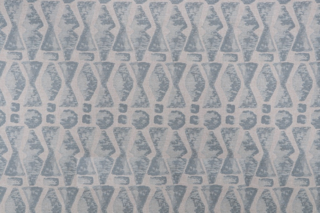 DESCRIPTION: Lacefield Designs Juju Fabric in Swedish Blue features a repeating geometric pattern that includes triangles, diamond shapes, and circles. The design has a somewhat retro feel. The primary colors are a soft, light blue (or Swedish Blue) on a natural beige fabric background.